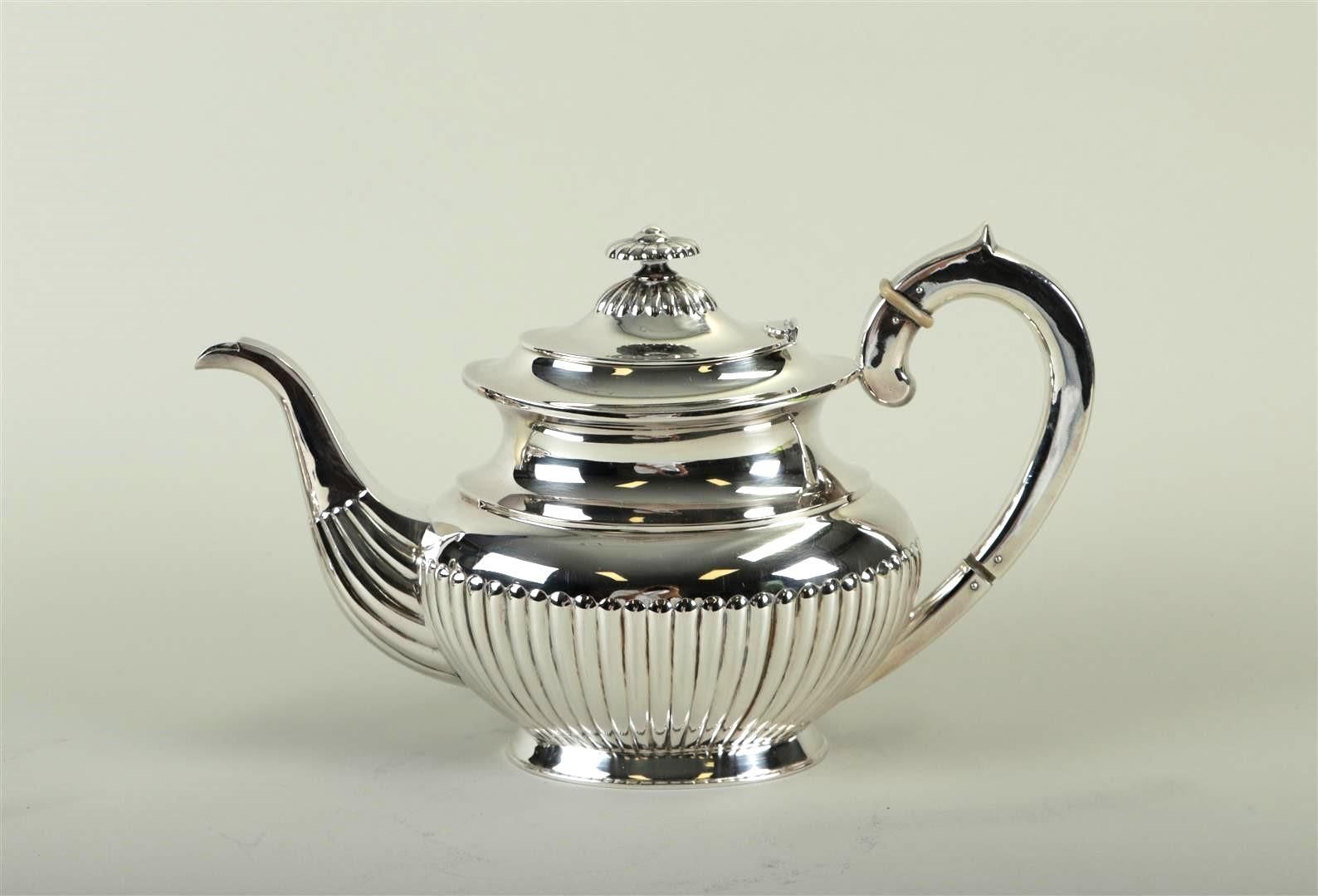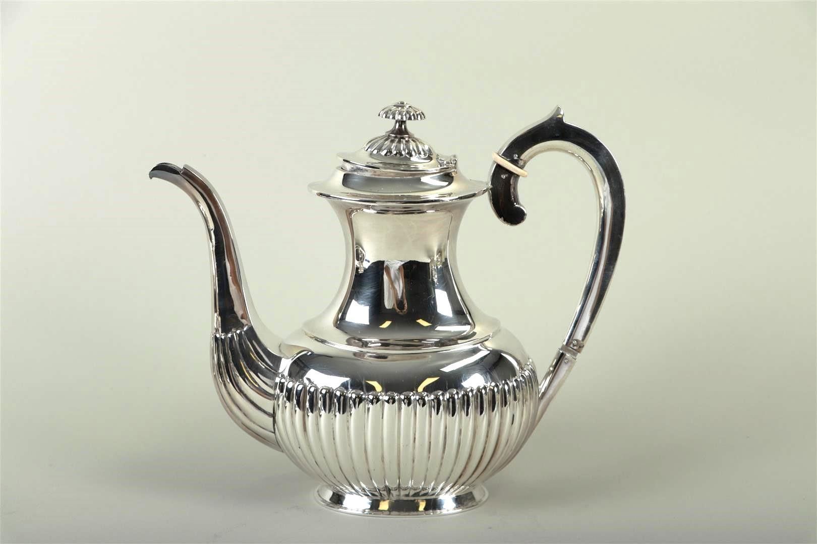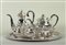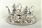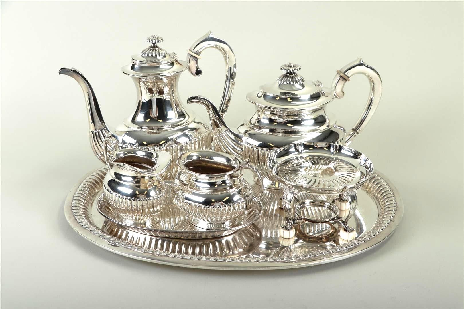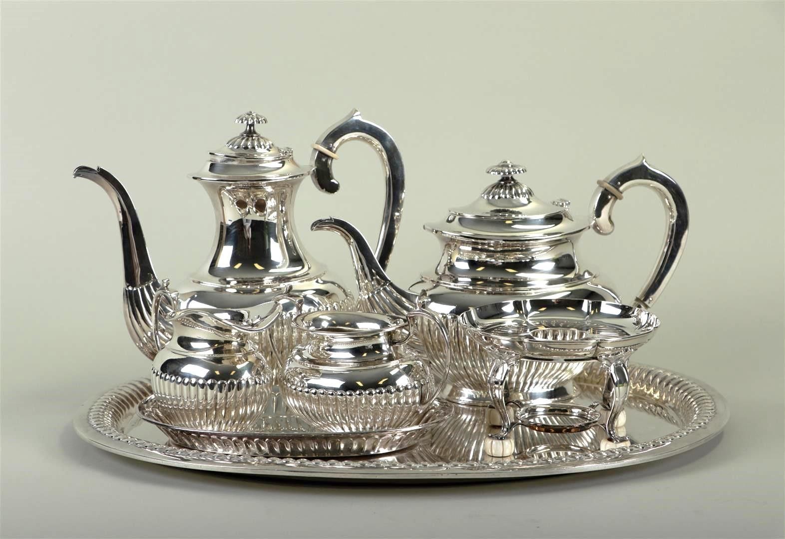 A silver seven-piece tea set consisting of a teapot, a coffeepot, a cream set...