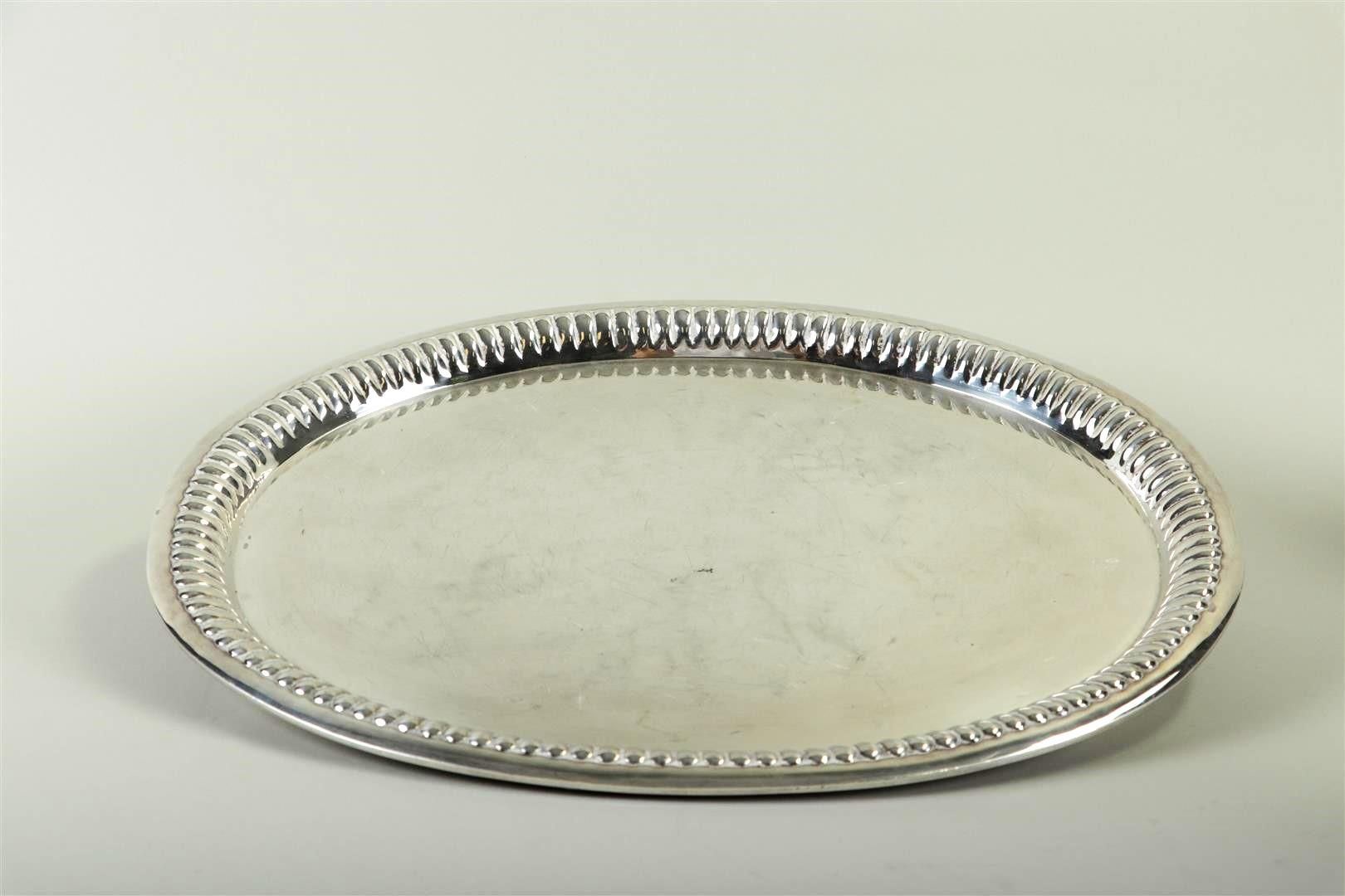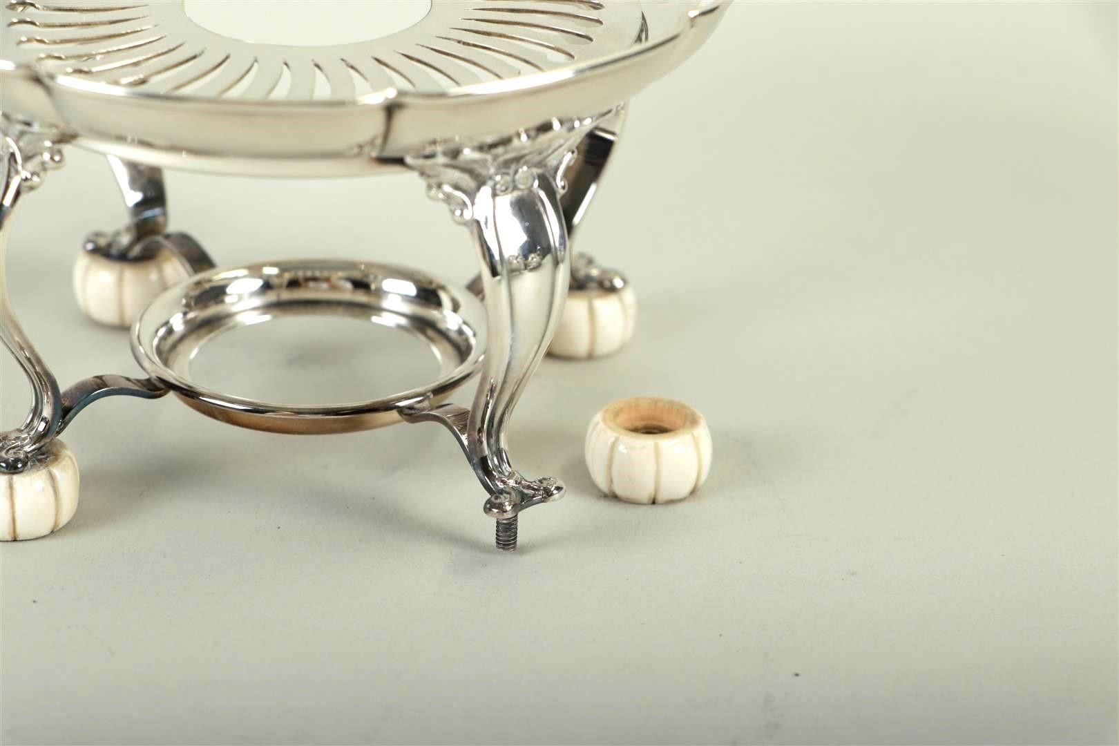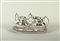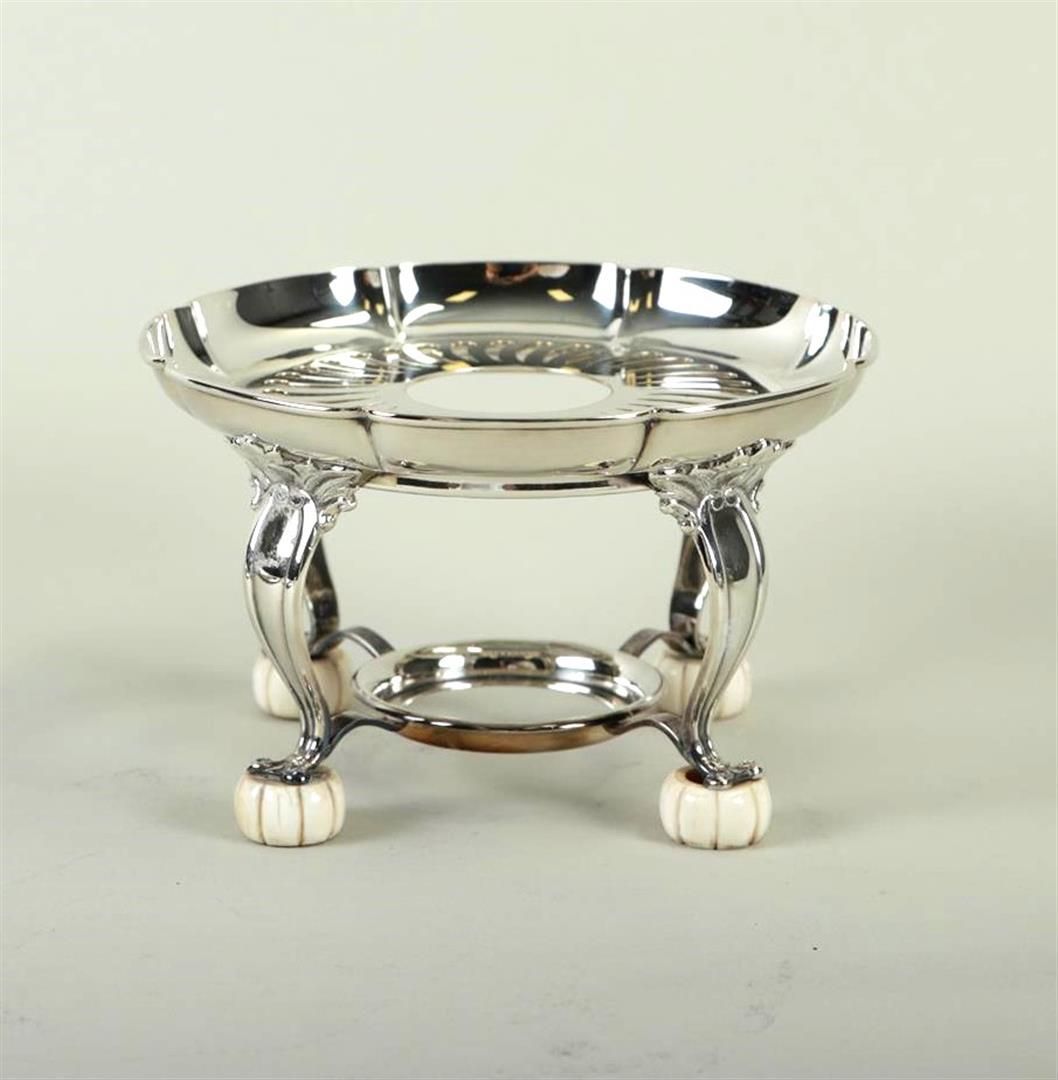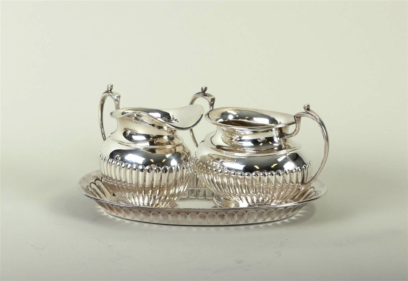 A silver seven-piece tea set consisting of a teapot, a coffeepot, a cream set on a silver tray. 2nd grade, marked (on the bottom). With a matching burner. Total weight: 3.225 grams.