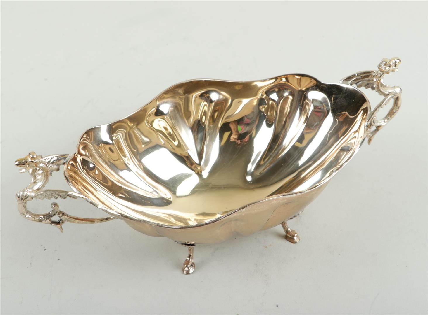 A large gilt, silver pleated bowl. The ears decorated with dragons. 1st...