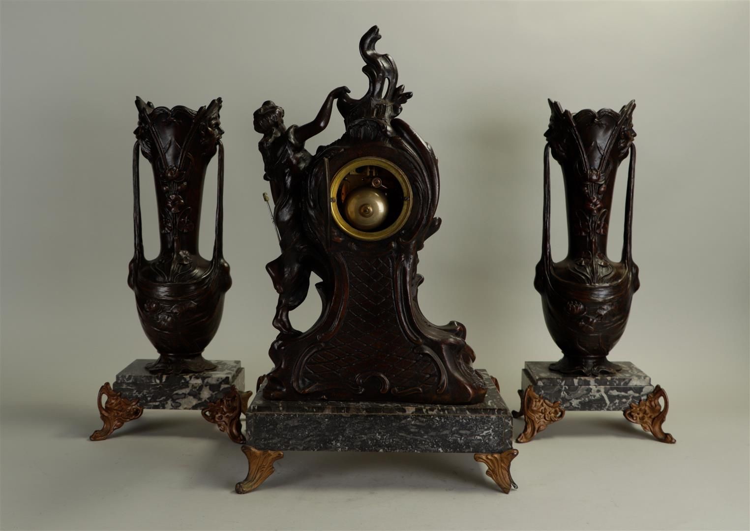 An Art Nouveau Garniture de Cheminée on a marble base with brass mounts. France, circa 1900.