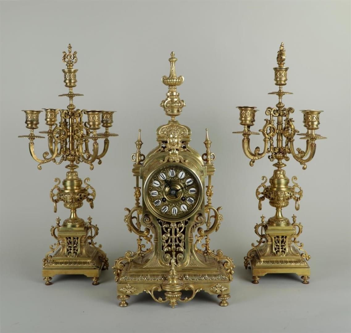 A bronze Garniture de Cheminée, timepiece addressed 'France & Chastant'. France, 1st half 20th century.