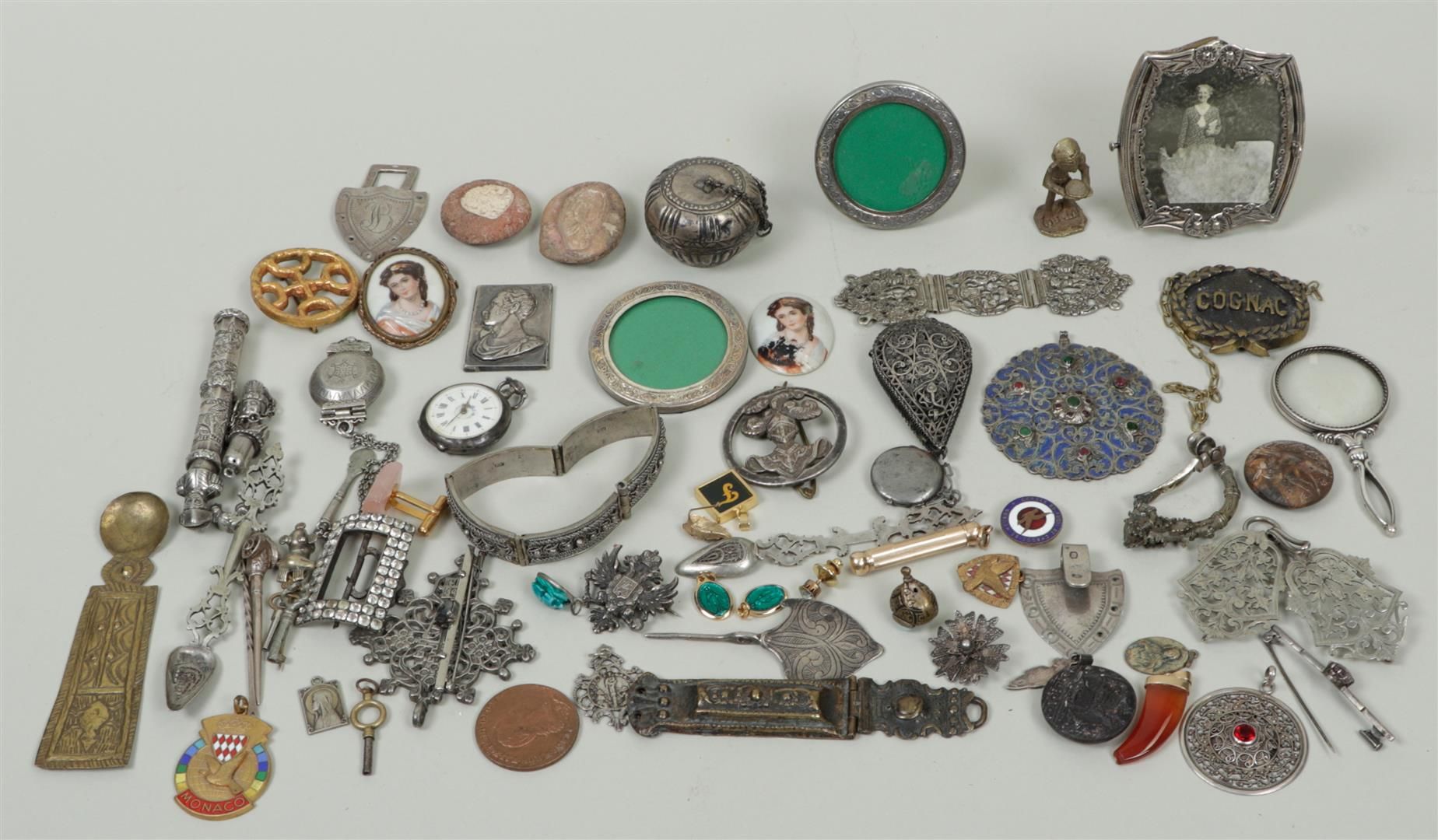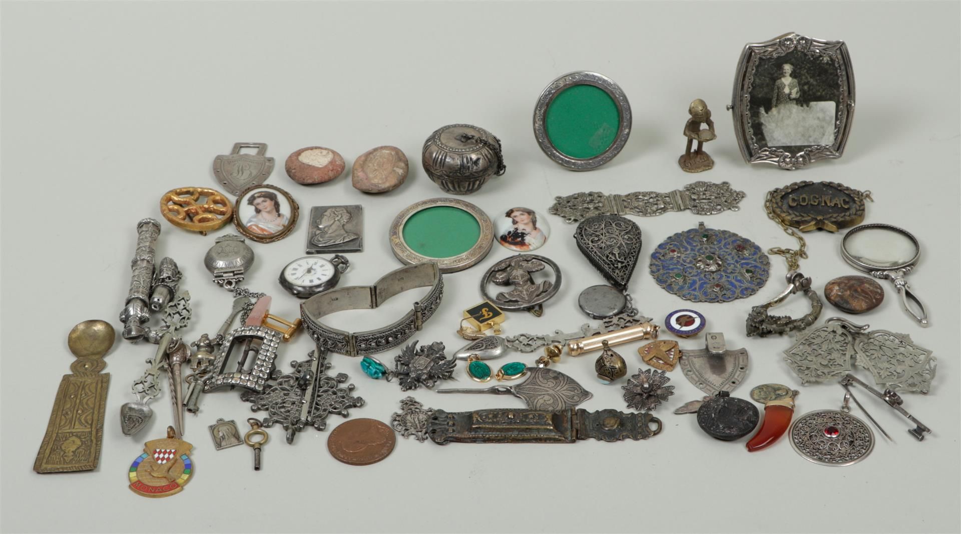 A lot with various objects including silver objects and buckles.