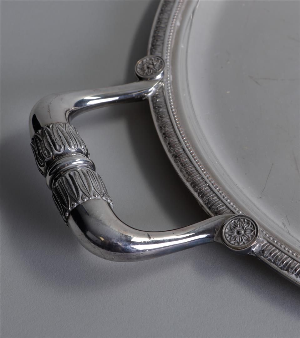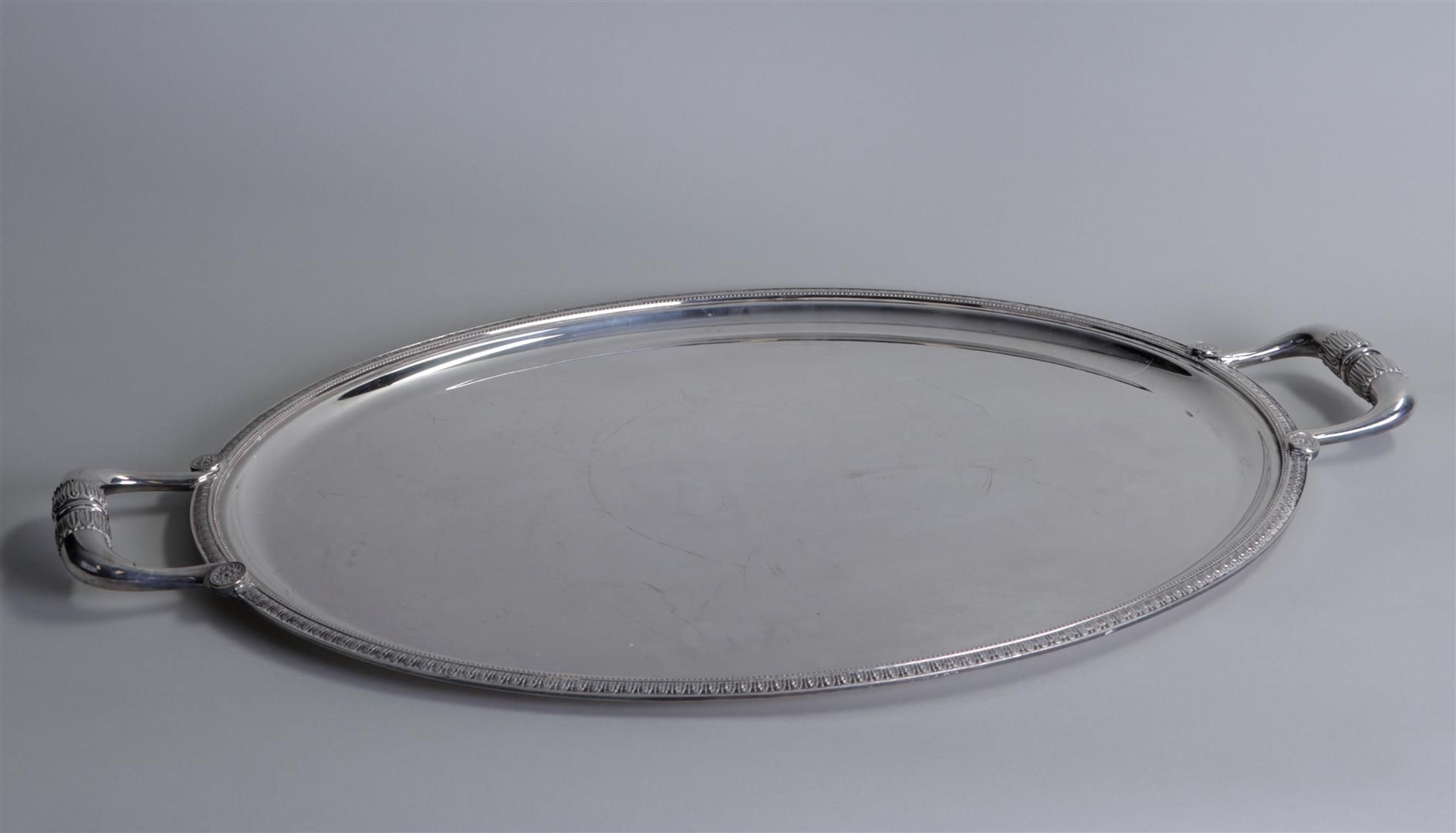 An oval, Christofle Malmaison tray, marked on the edge. 53 x 42 cm.