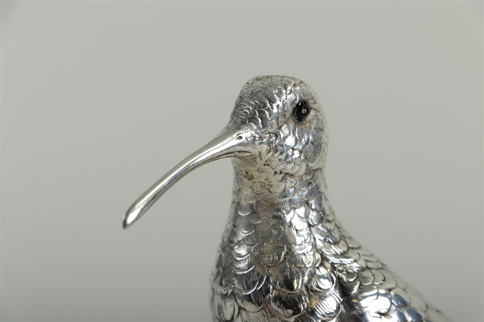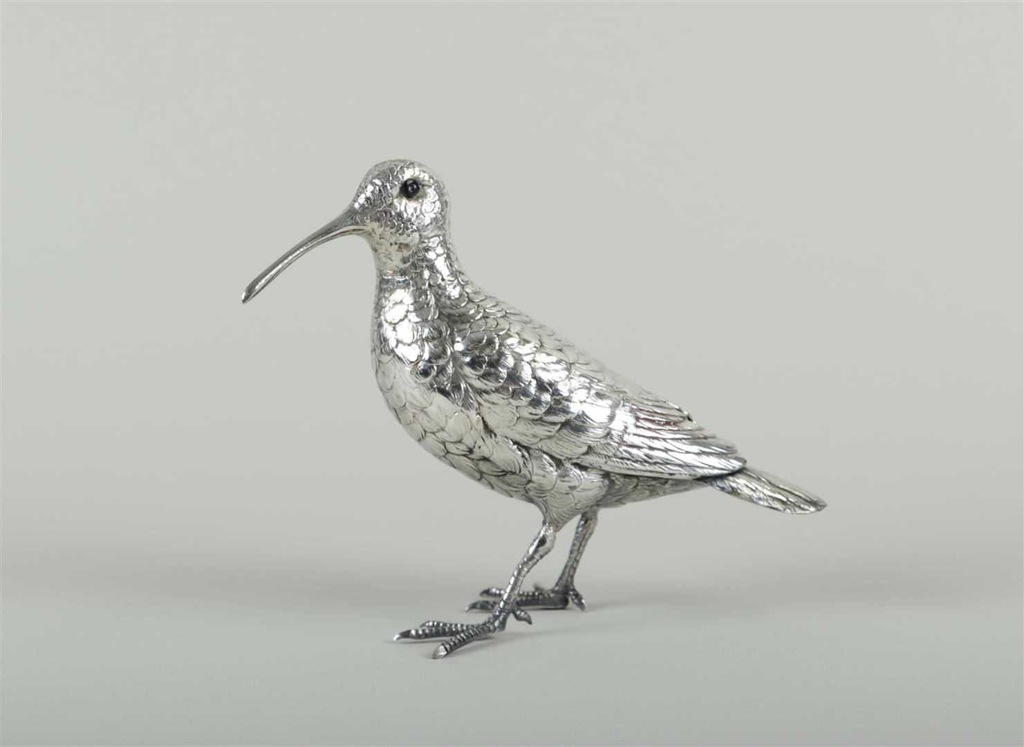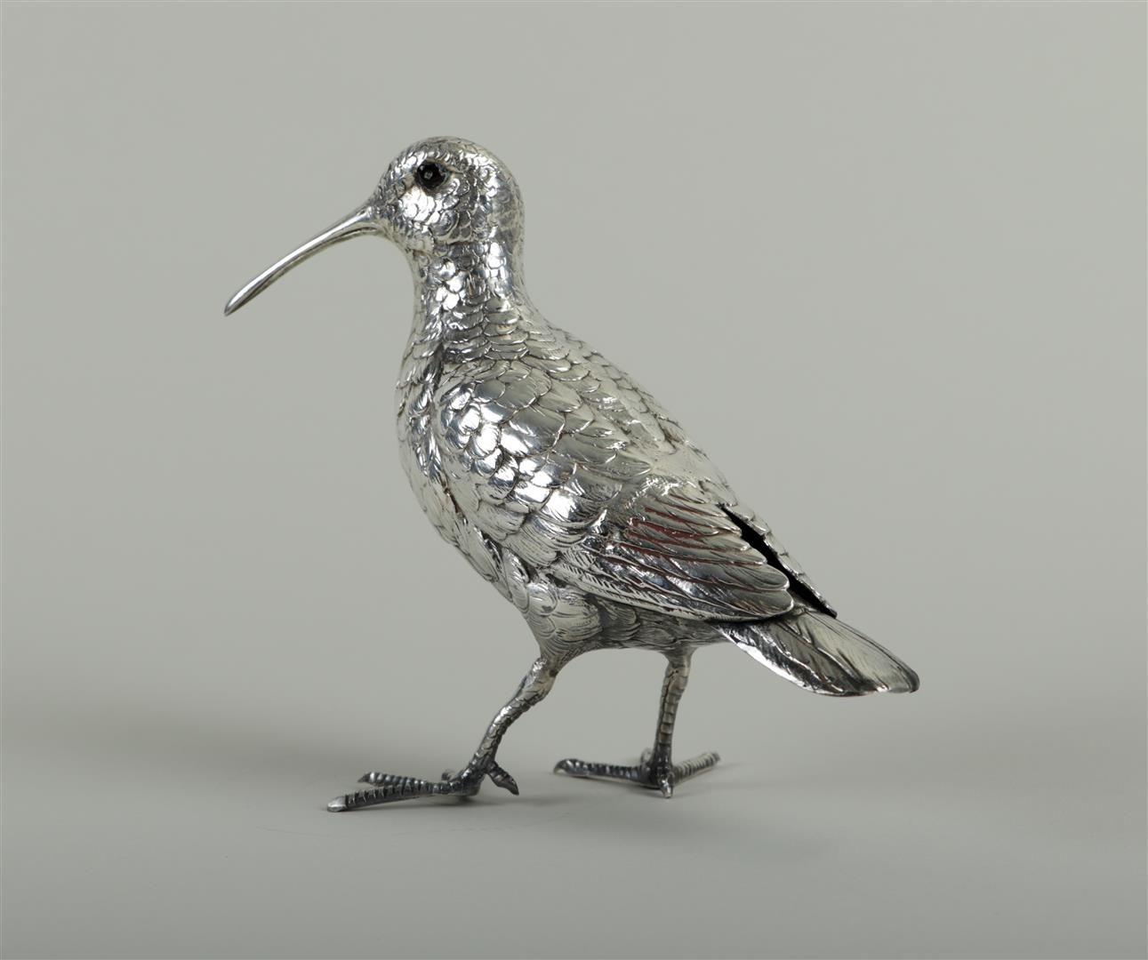 A silver table piece in the shape of a bird (snipe). One glass eye missing. Marked (under the leg), 211 grams.