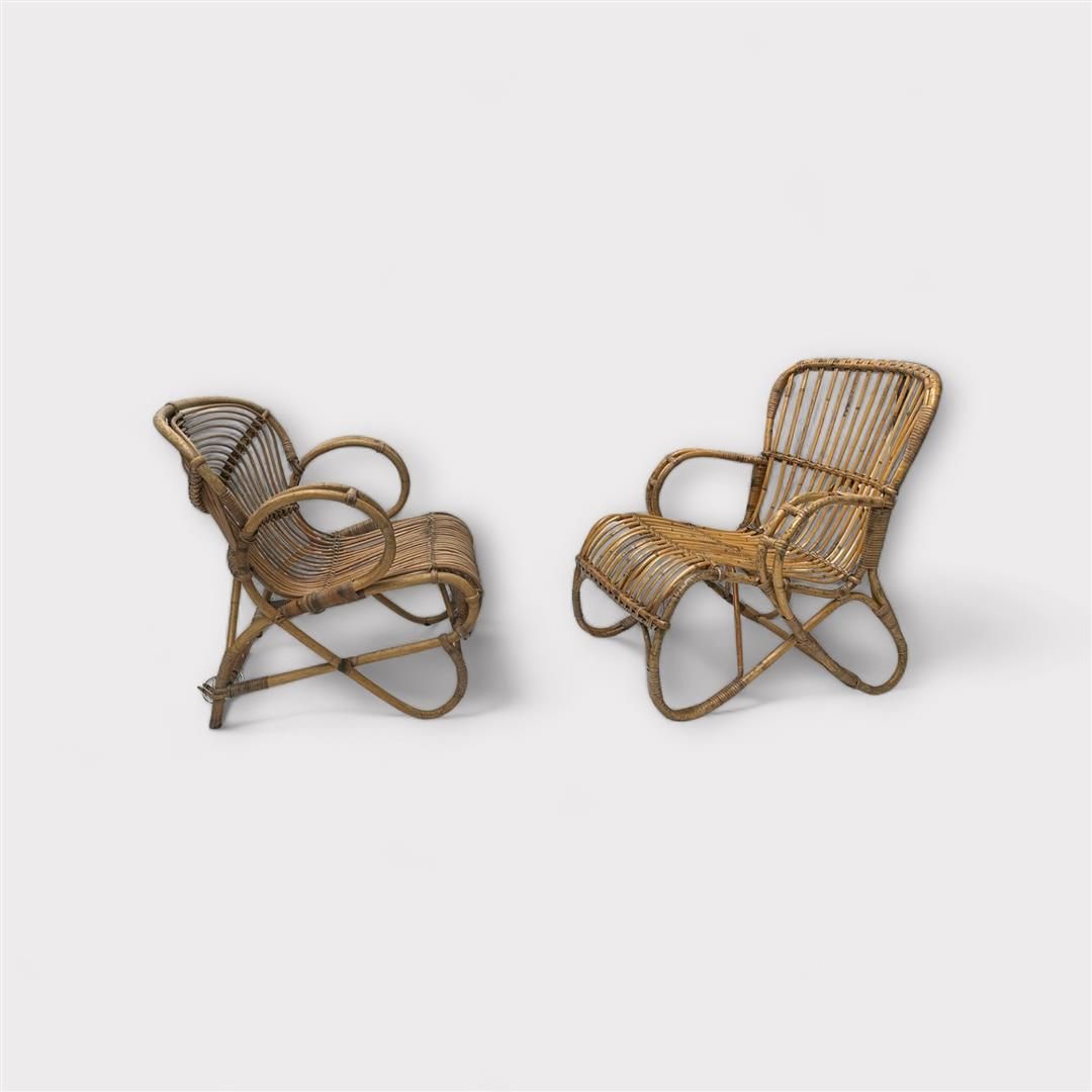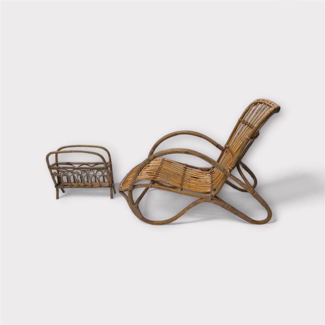Lotto 193 | A lot consisting of (3) vintage rattan chairs, and a matching magazine rack,...