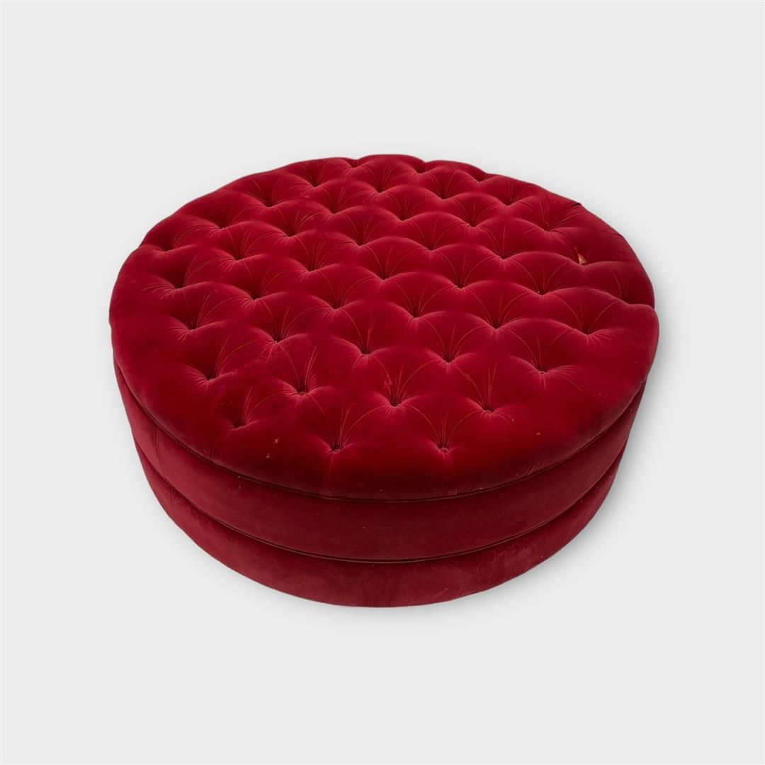 Lotto 194 | A large tufted showroom pouffe covered with red fabric. Diam.: 120 cm.