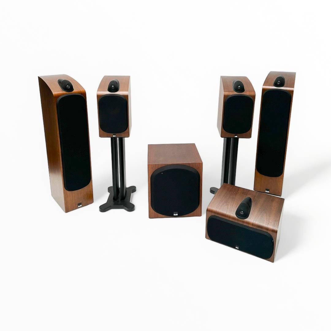 Top of the range: Bowers & Wilkins / B&W 703, HTM7, 705, ASW750 surround speaker system. The set is in very good playable condition. The cables were built away and will have to be ordered by the buyer.