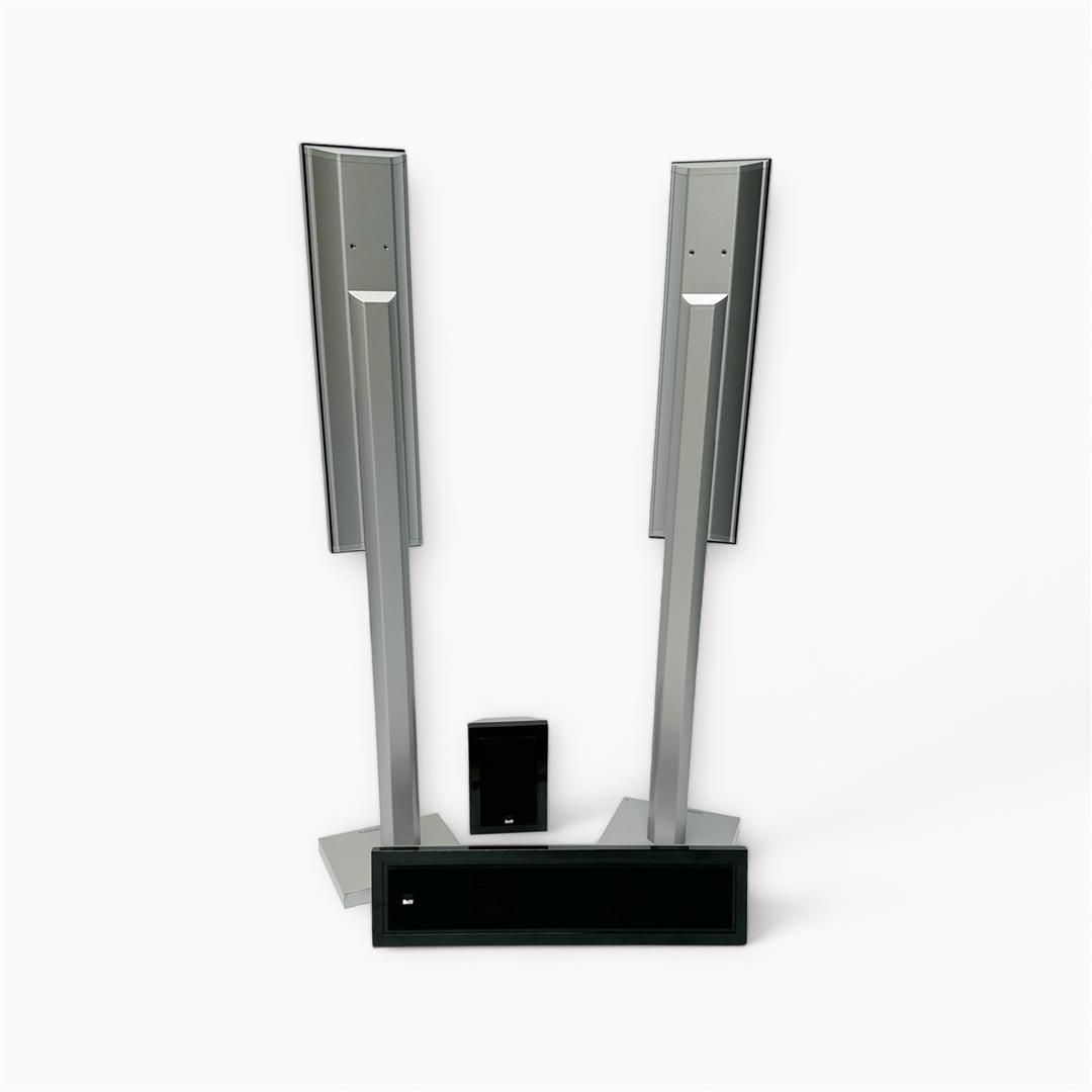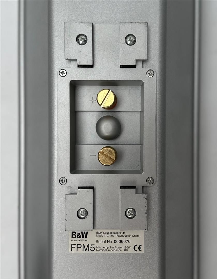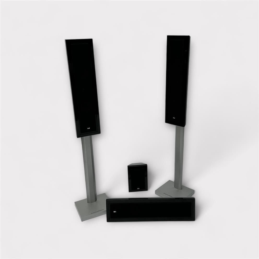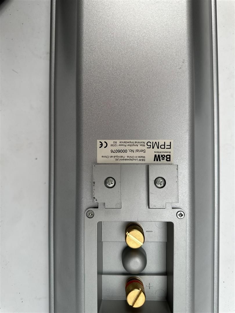 Bowers and Wilkins FPM5 speaker (Pair) on stand, a wall speaker, and a soundbar.