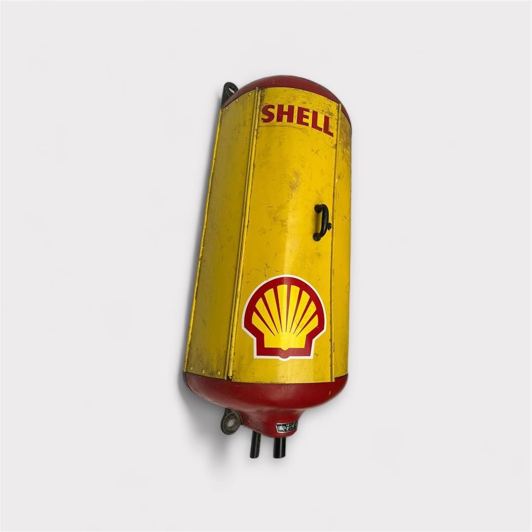 A vintage "Shell" wall mounted petrol pump in unrestored condition. Inside...