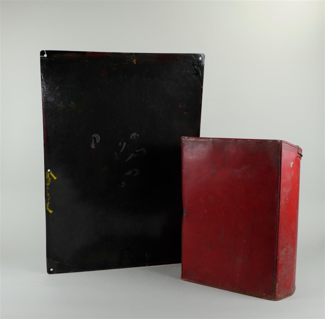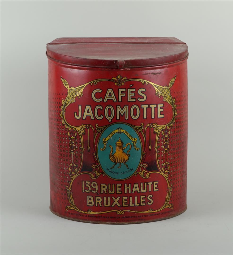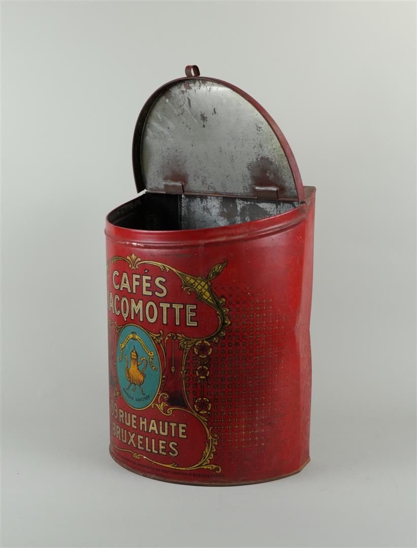 An enamel advertising sign for Douwe Egberts made by Langcat Bussum, along with a large metal coffee tin from Cafés Jacqmotte.