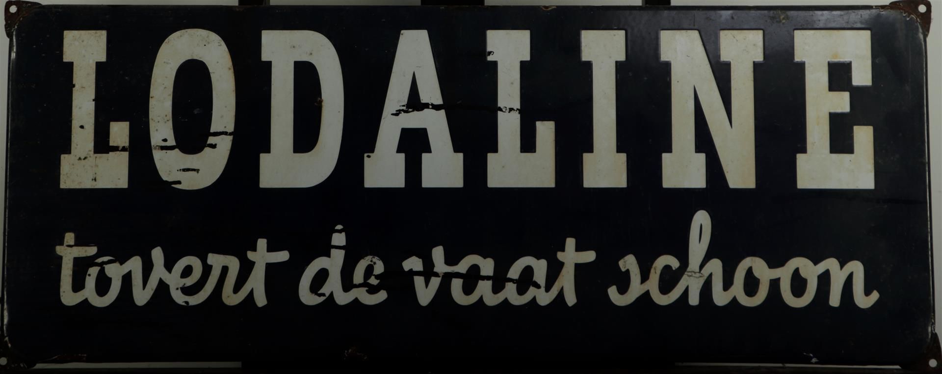 A large vintage Lodaline enamel advertising sign 'Make the dishes clean'.