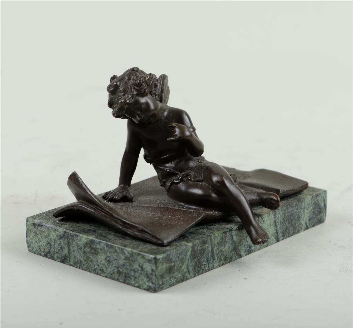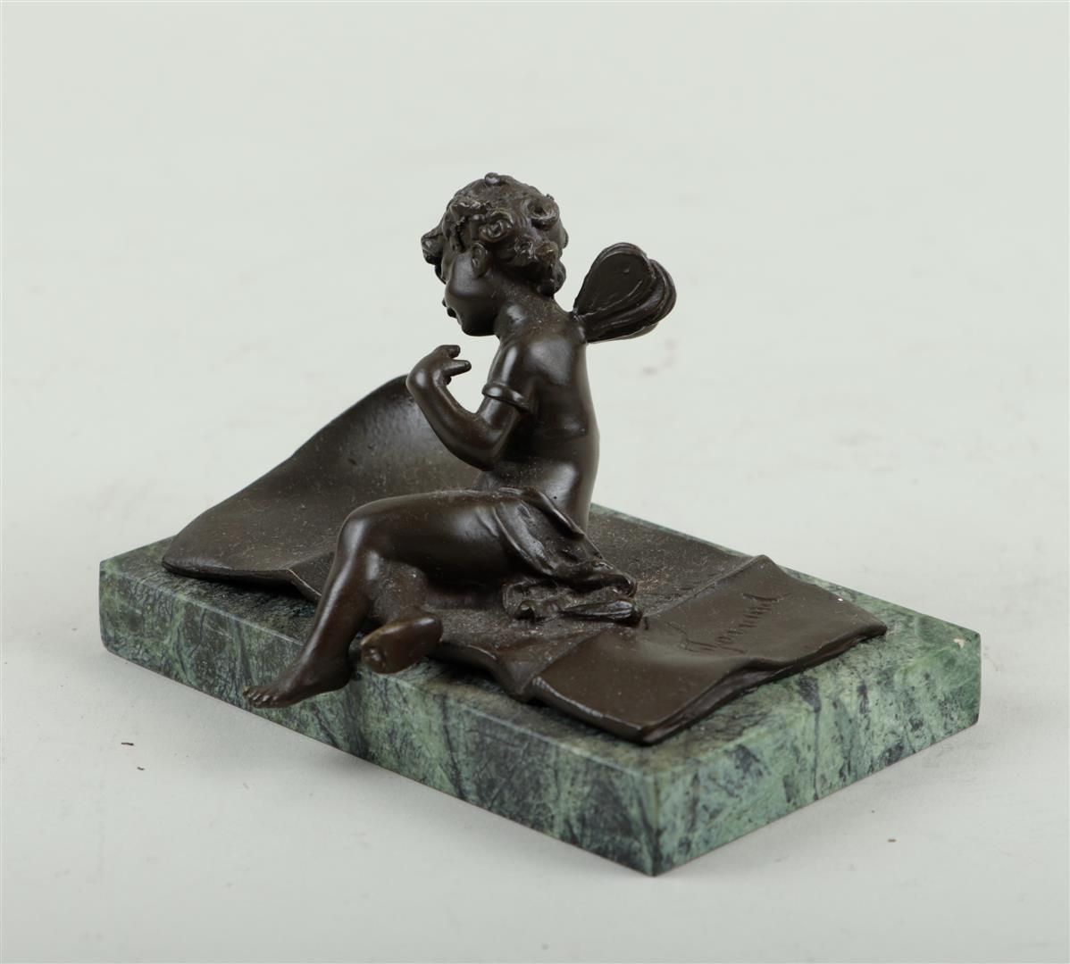 A lot consisting of (2) desk ornaments, one depicting a putto in a boat after 'Moreau', and a psyche figure sitting on a letter, after Ferrand, 20th century.