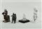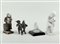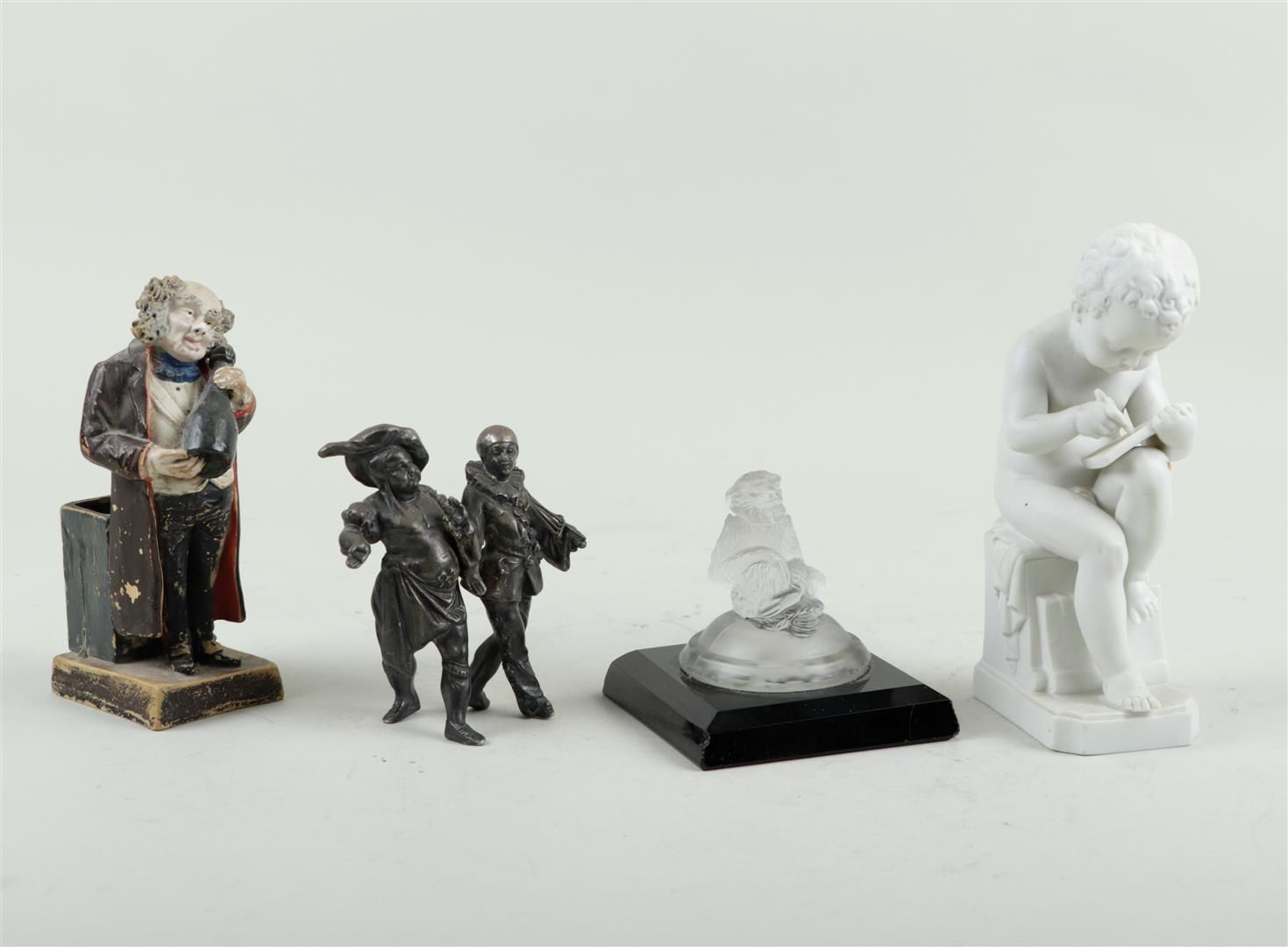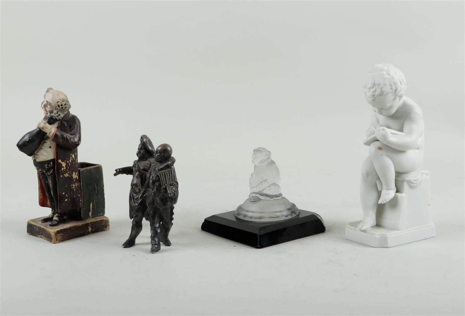 A lot consisting of (4) various figurines including a writing putto after Anotion Canova made of biscuit, an earthenware, late 19th century match holder in the shape of a drunkard, a pressed glass monkey, base damaged, and a bronze of two Commedia Del Arte figures: Il Capitano & Pulcinella.