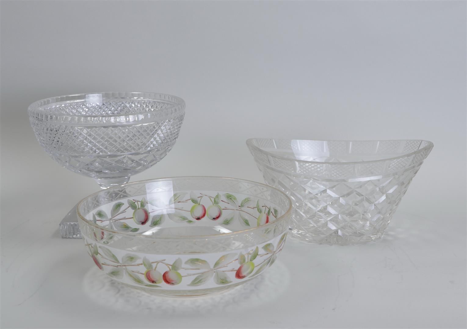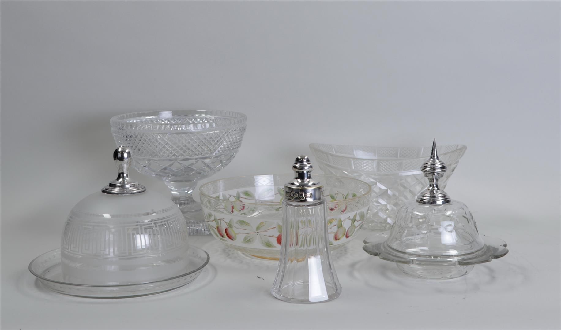 A lot consisting of (2) bell jars with silver knob, a dropper with silver-plated stopper, two cut fruit scoops, and a glass fruit bowl.