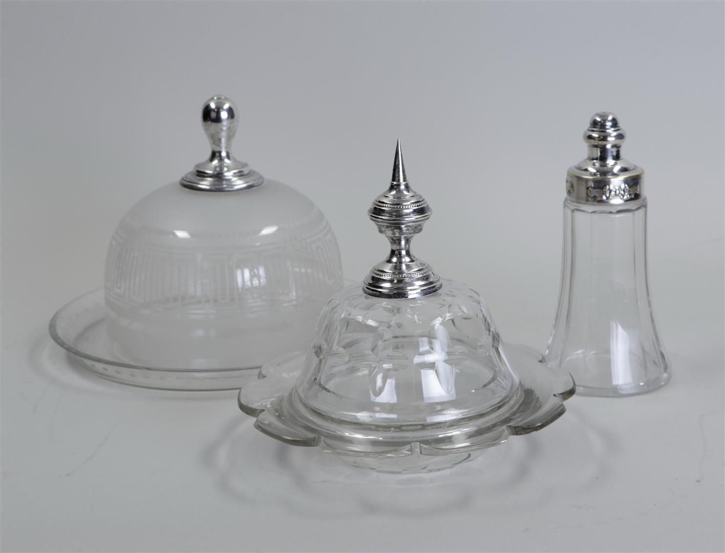 A lot consisting of (2) bell jars with silver knob, a dropper with...