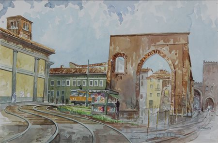 Donati Bisio Basilica di S. Lorenzo acquerello su carta, cm. 33x50 firmato in basso a destra, certificato di garanzia e autenticità della Galleria Mimmo Massante di Milano senza cornice