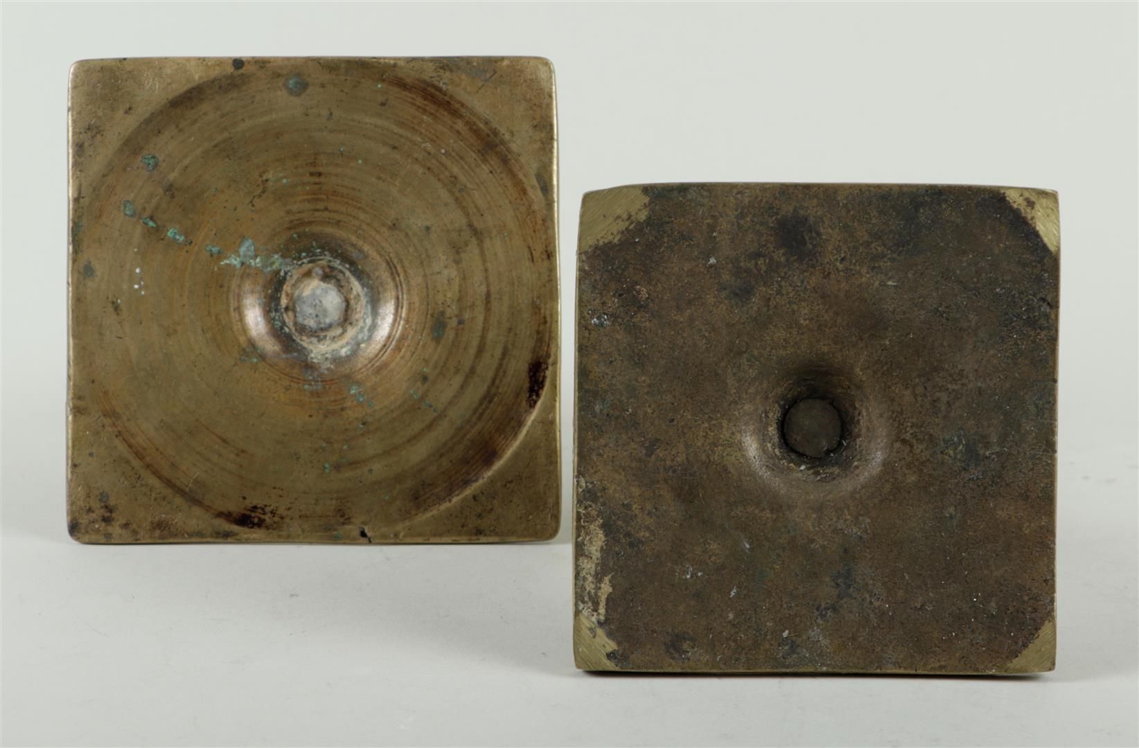 A lot of two Spanish brass candlesticks on a square base, 17th/18th century.