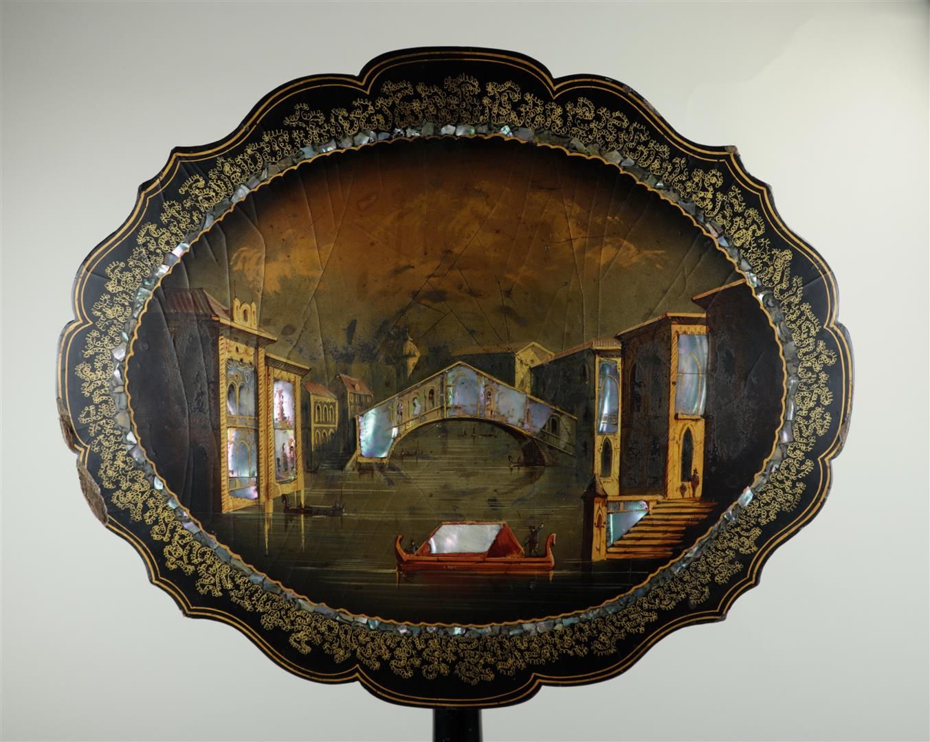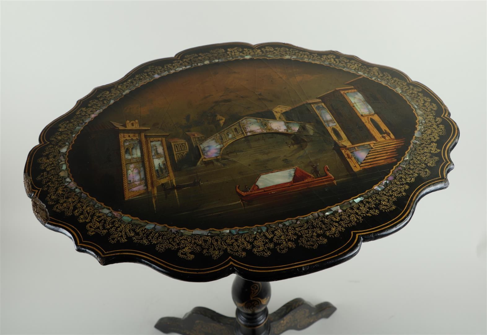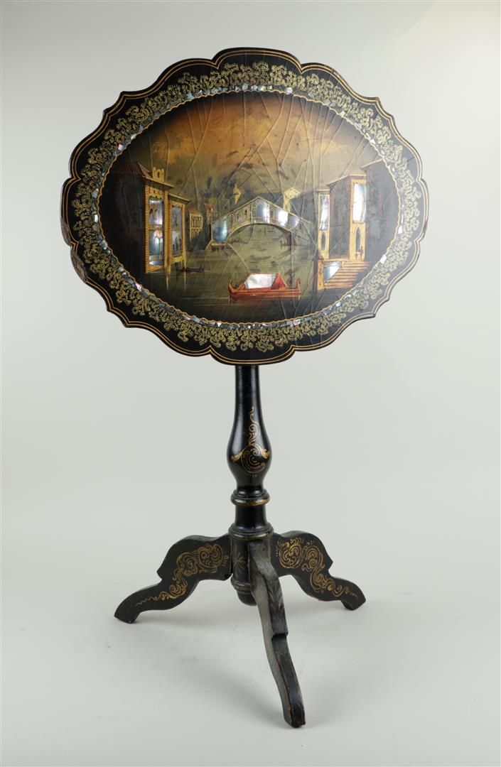 An oriental side table, decorated on the top with the Bridge of Sighs, Venice, made of mother of pearl. 19th century.