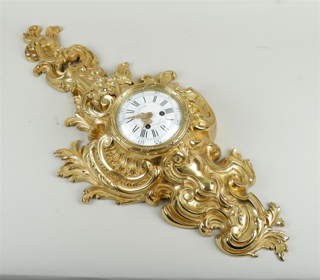 A large gilt rococo style cartel clock, signed on the dial 'A LA GERBE D'OR'...