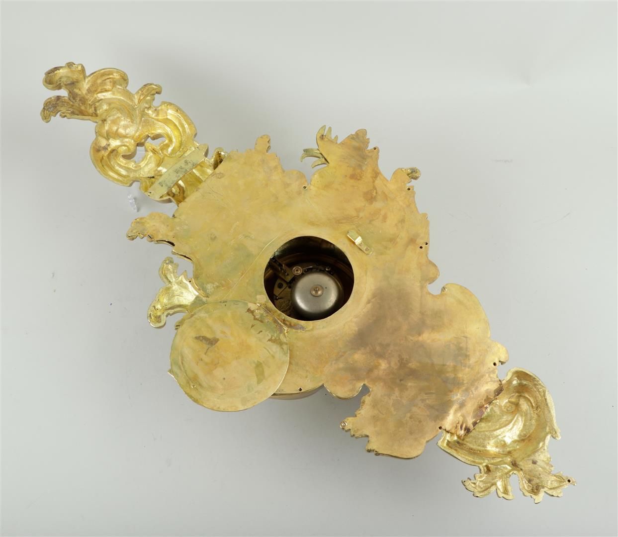 A large gilt rococo style cartel clock, signed on the dial 'A LA GERBE D'OR' Rue de Rivoli 86 Paris. France, late 19th century.