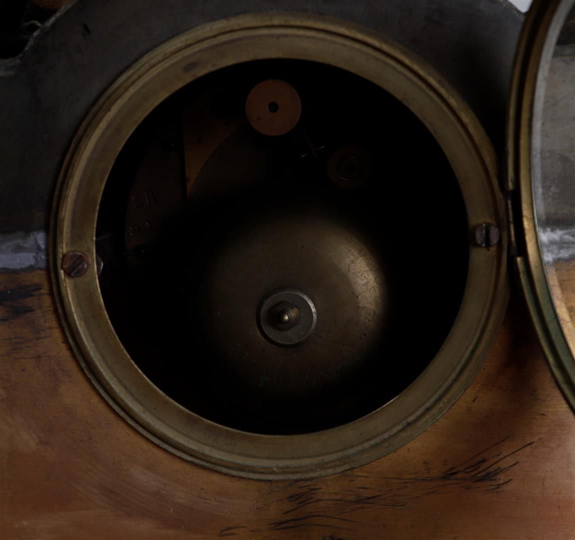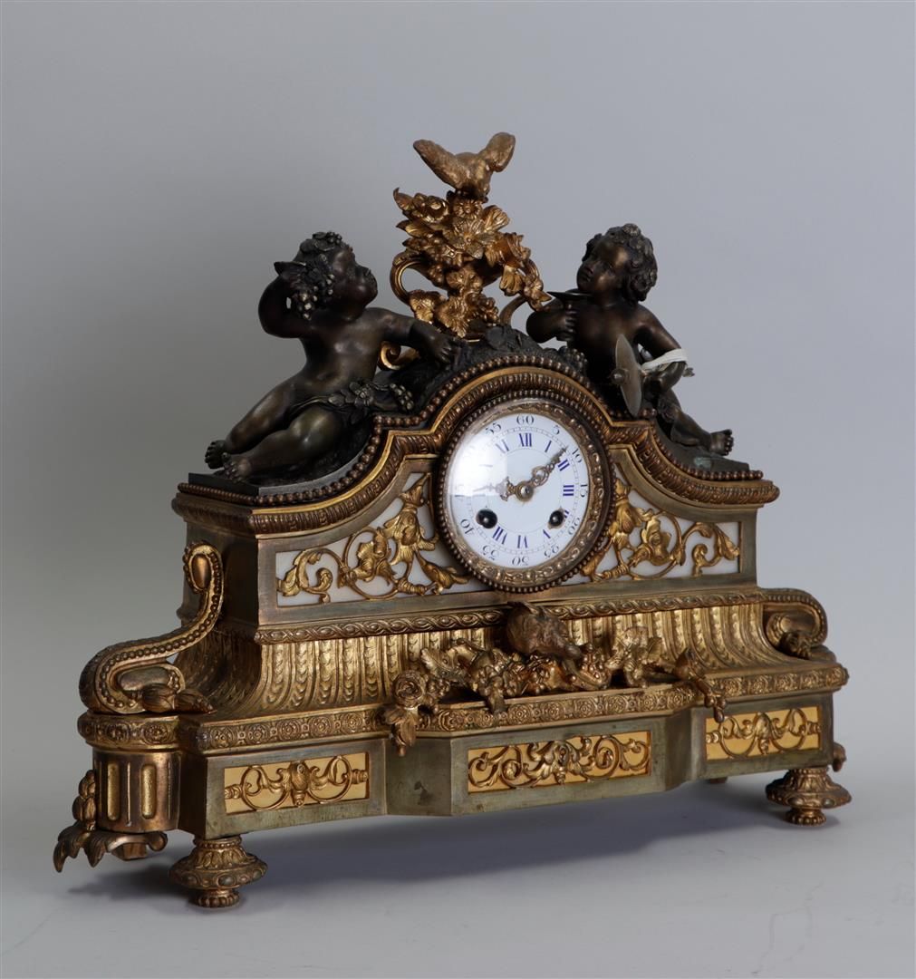 Lotto 299 | A Louis XVI bronze partly fire-gilt mantel clock decorated with Puto, enamel...