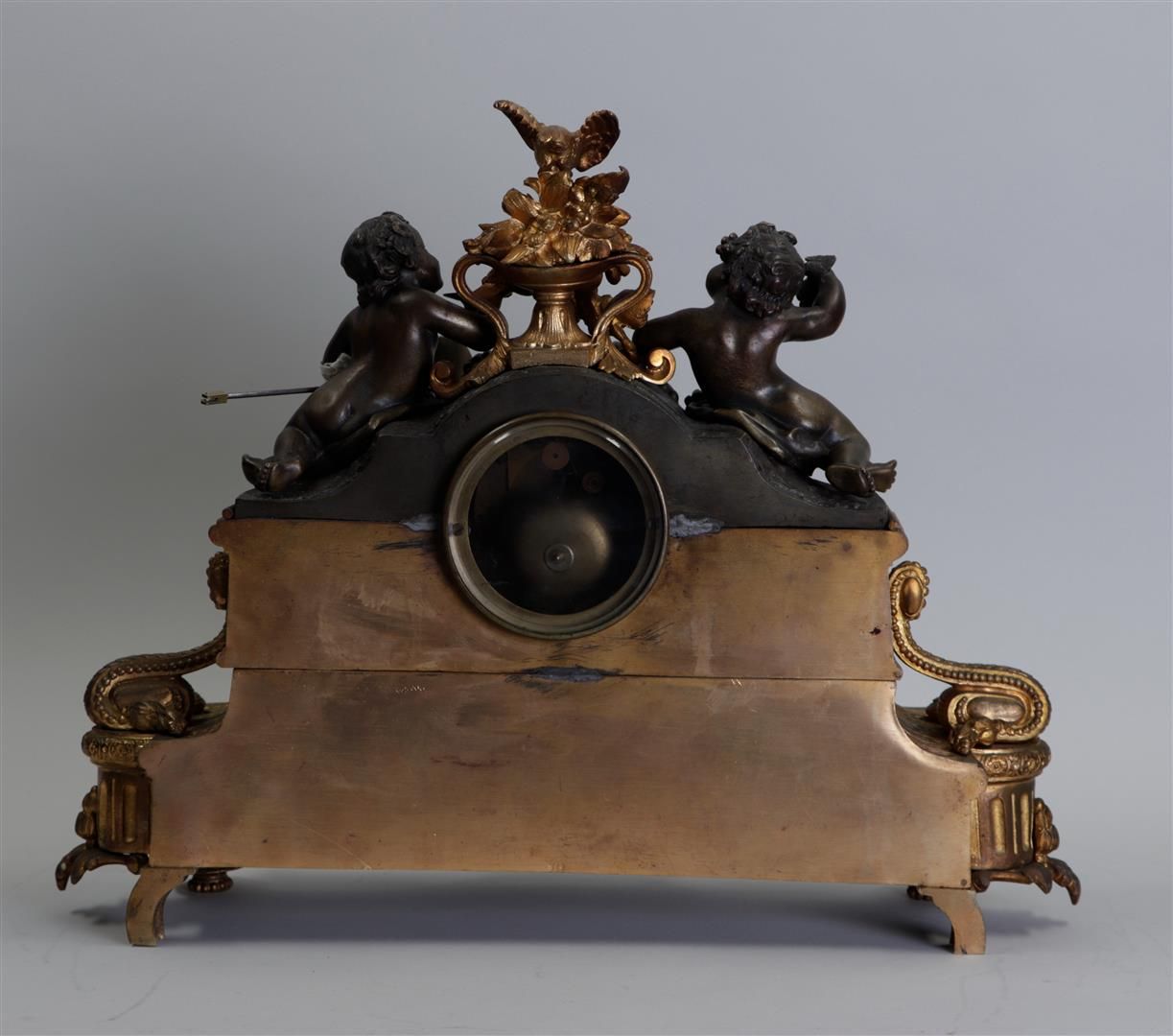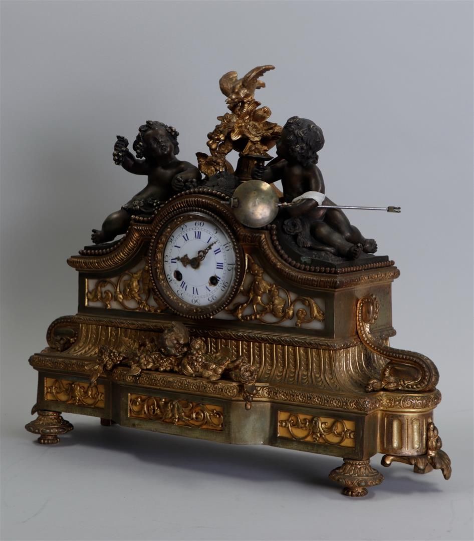 A Louis XVI bronze partly fire-gilt mantel clock decorated with Puto, enamel dial with Roman numerals. France, mid 19th century.