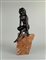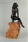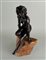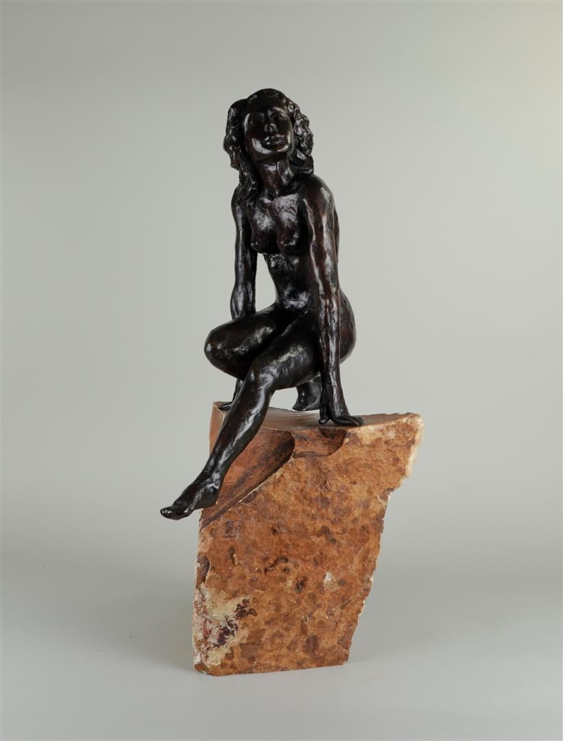 A large, dark patinated bronze sculpture of a crouching nude on a stone.