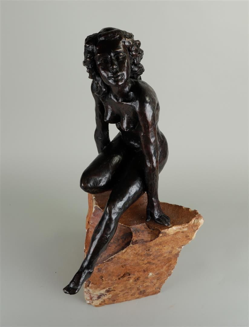 A large, dark patinated bronze sculpture of a crouching nude on a stone. 72 x...
