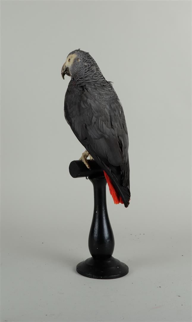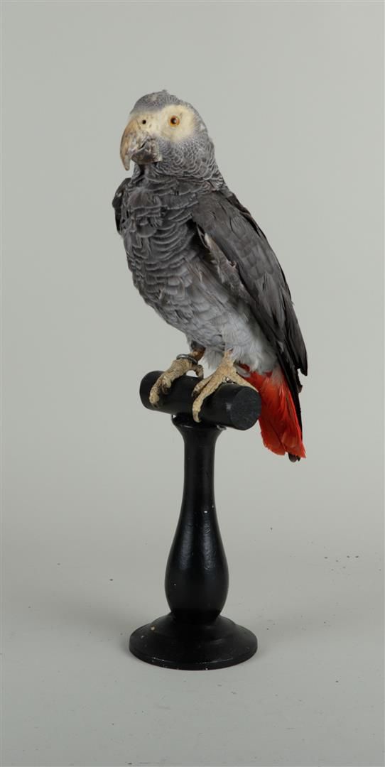 An African grey parrot, taxidermy, late 20th century. (ringed). H. 42 cm (inc...