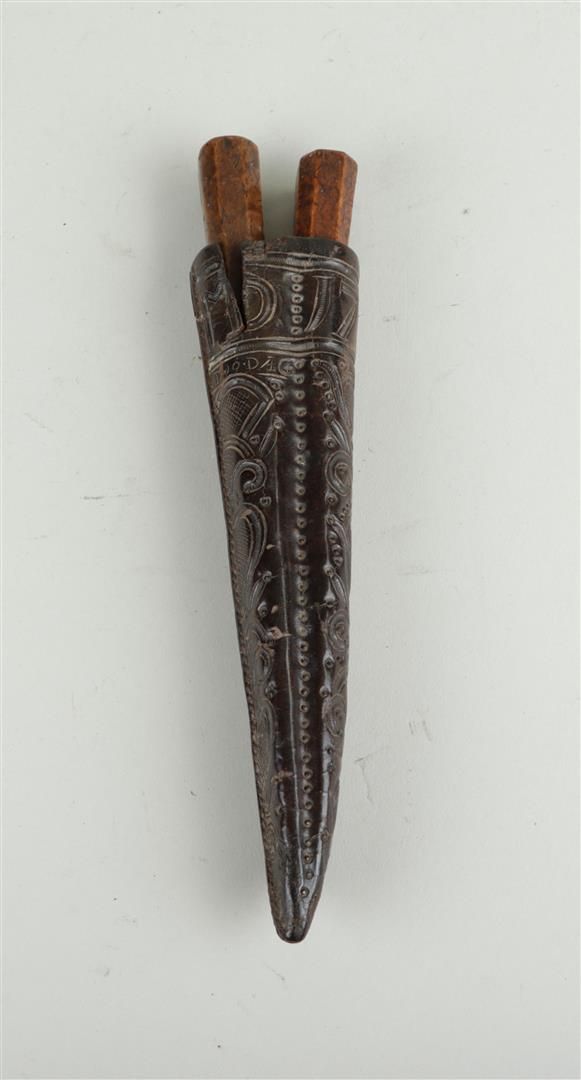 An antique Dutch travel cutlery set consisting of a fork and a knife with a wooden handle in a leather case, dated in the case '1782'.