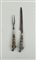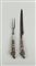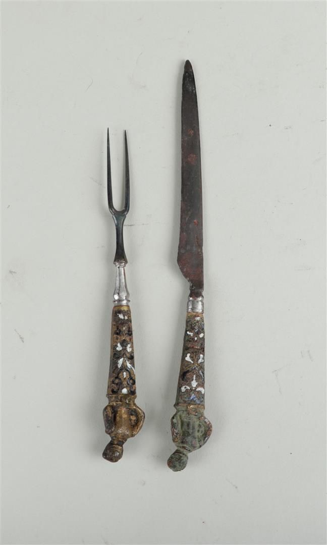 A set consisting of a meat fork, bronze handle with champlevé enamel in the form of stylized flowers and curls and a figure on it. Dutch, 2nd half of the 17th century.