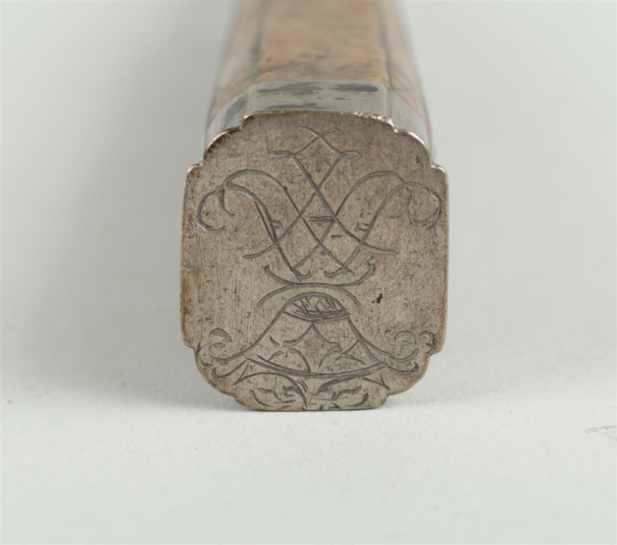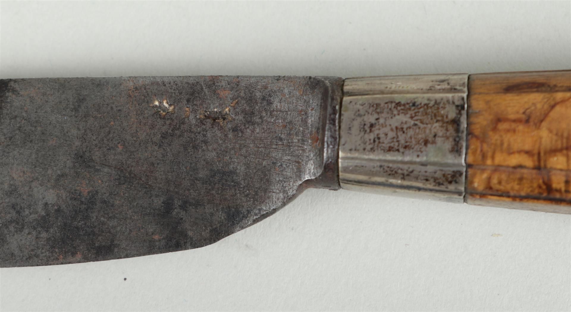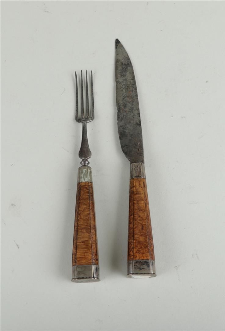 A travel cutlery consisting of a knife and fork with walnut handle with silver end pieces and silver rings with engraving. Circa 1750.