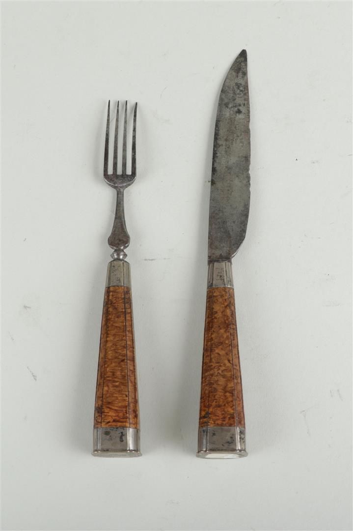 A travel cutlery consisting of a knife and fork with walnut handle with...