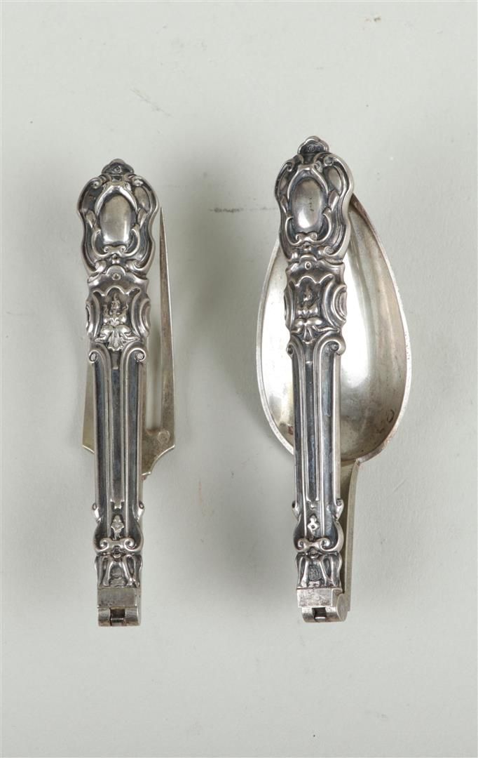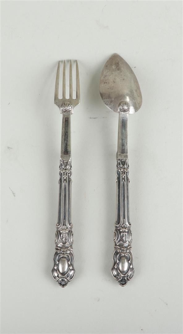 A set of silver folding cutlery consisting of a spoon and a fork in rococo...