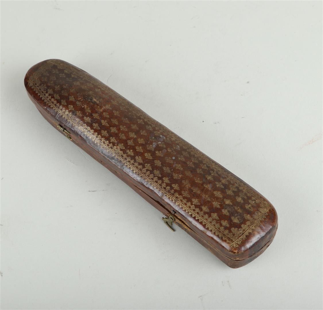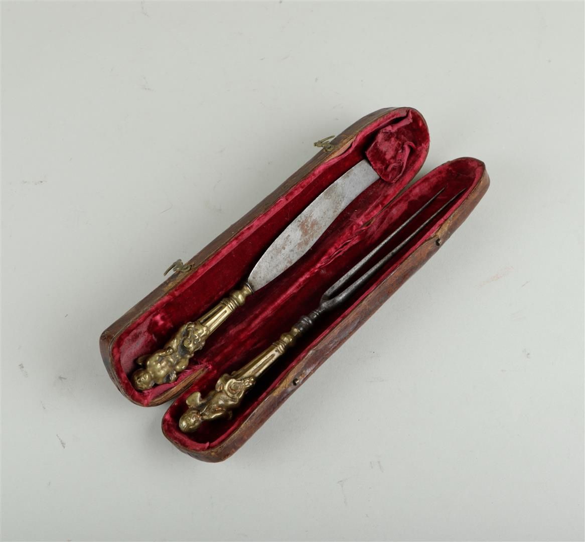 A set of cutlery consisting of a knife and a meat fork, worked with bronze putto, in a leather case. France, 19th century.