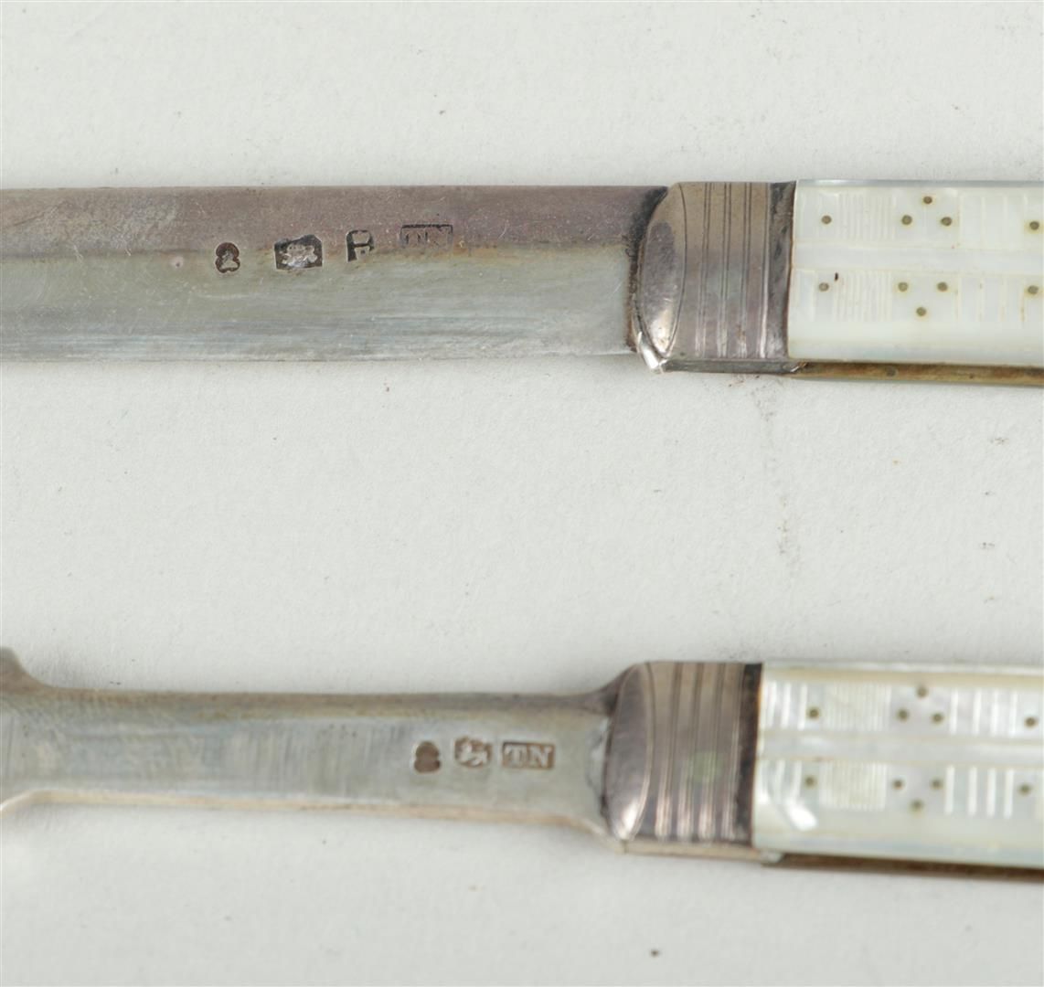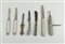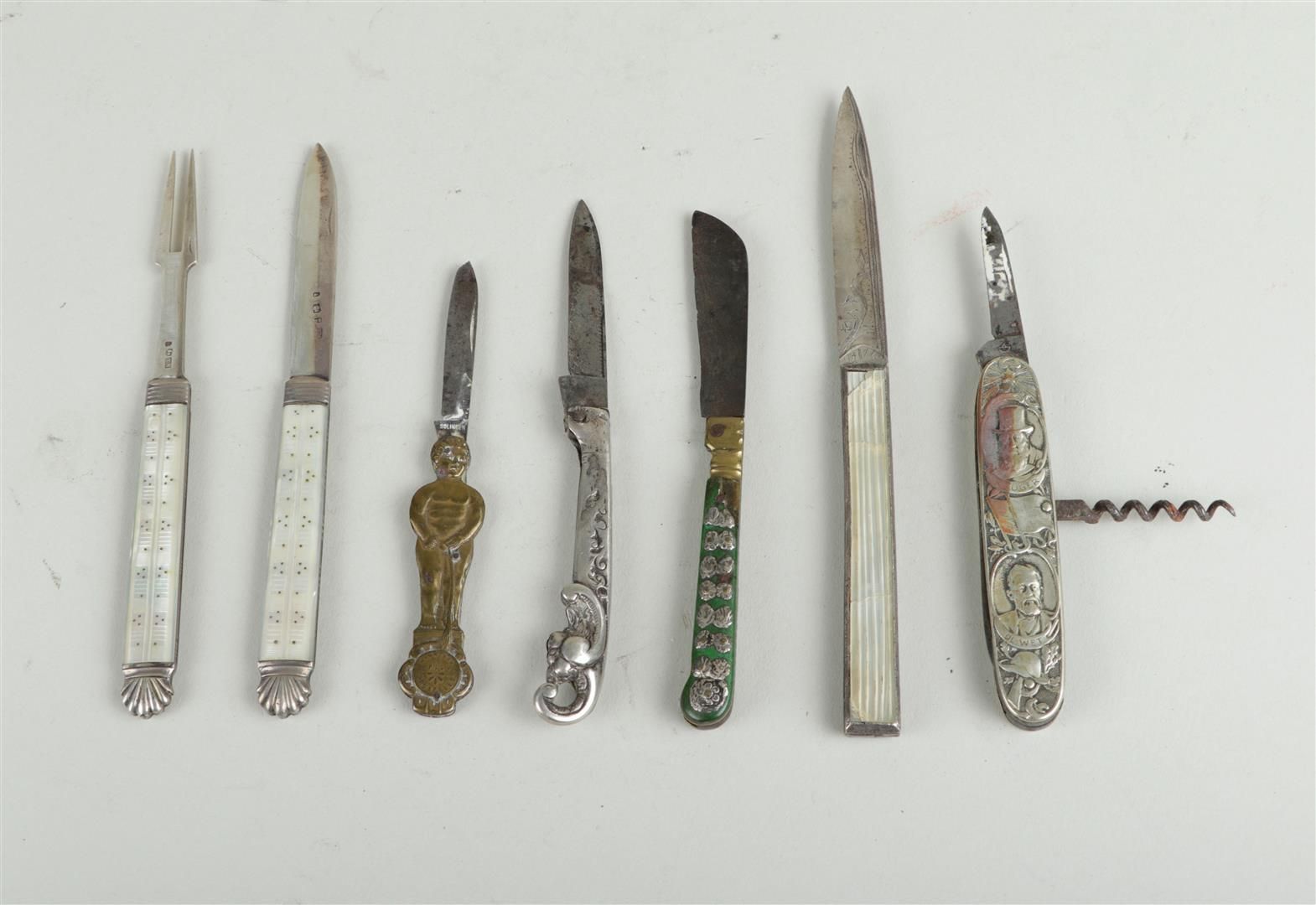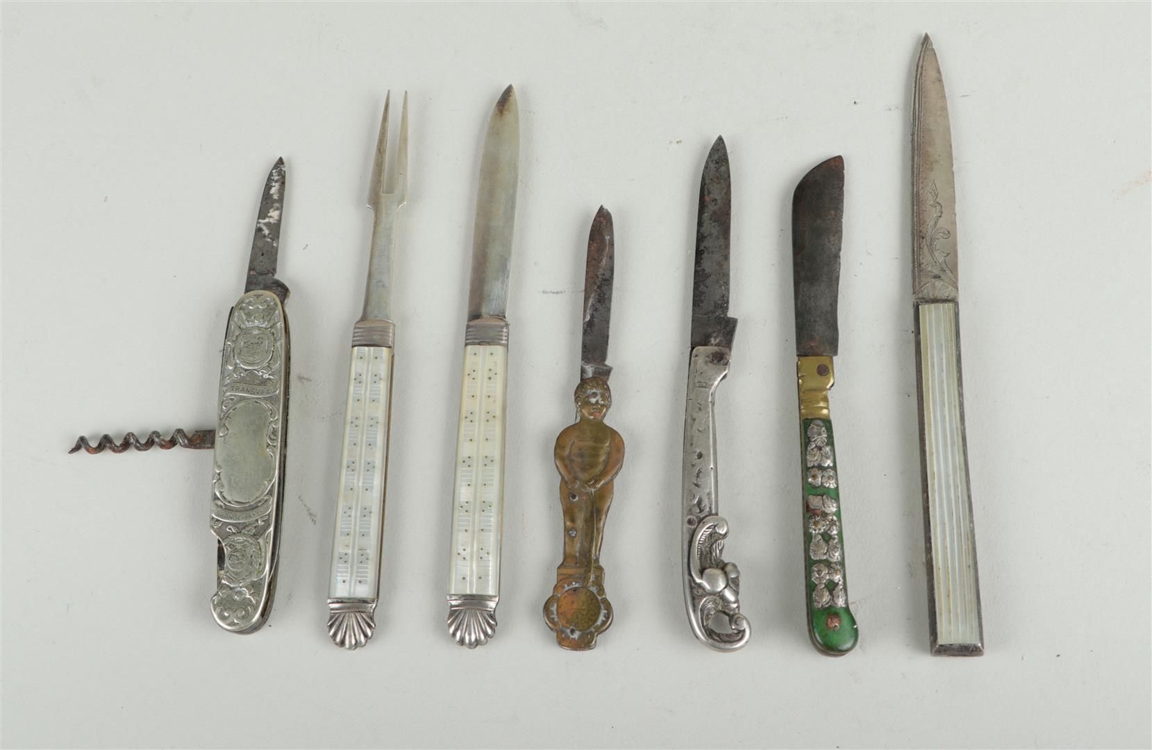 A lot of seven antique pocket knives, including one in silver. 19th century.