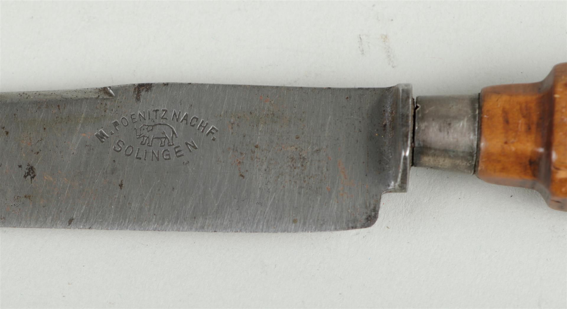 A set of four German 19th century knives with (palm)wood figures of saints. M. Poenitz nachf. / Solingen.