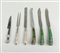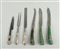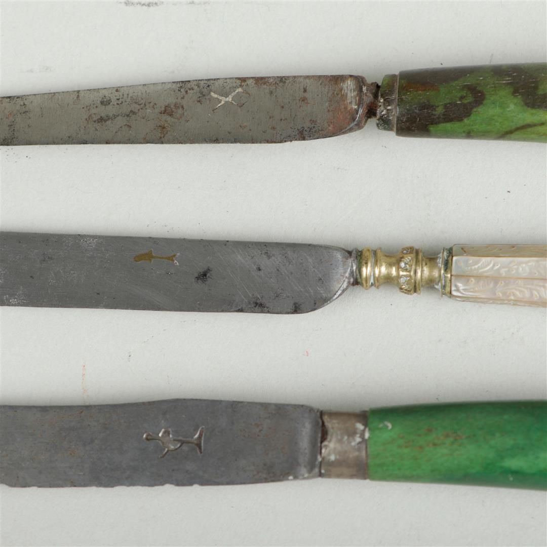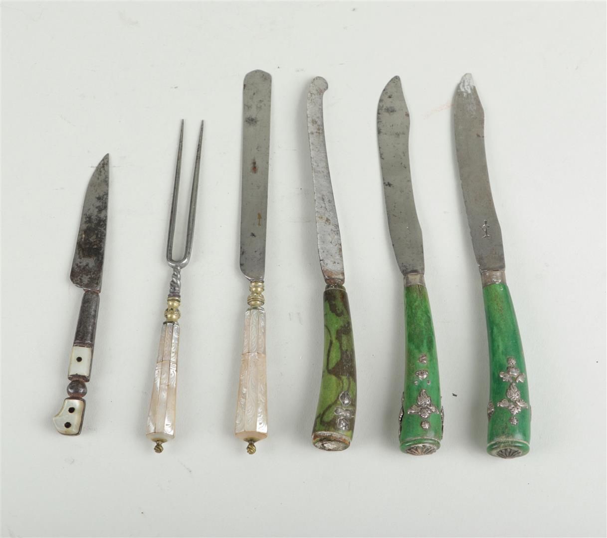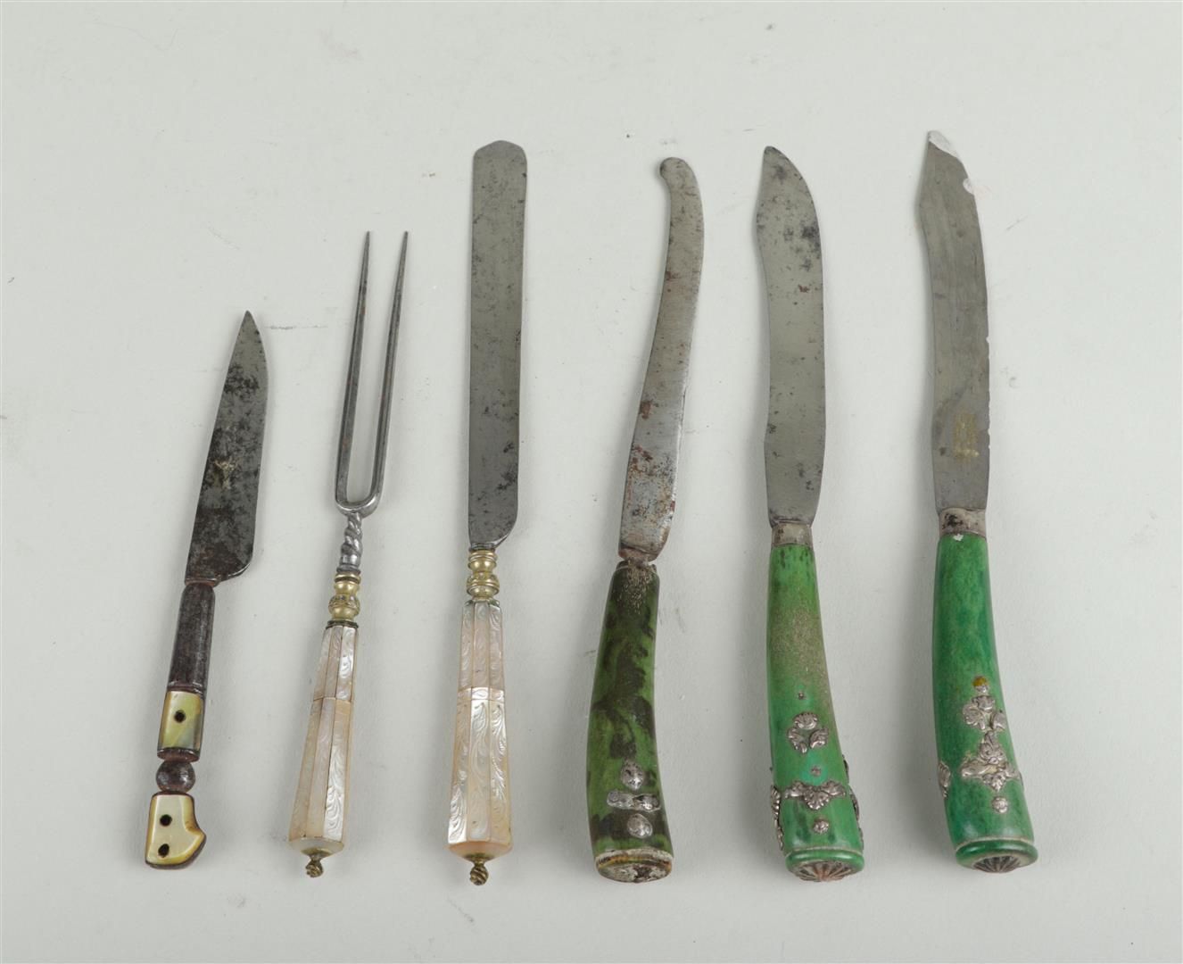 A lot of various 19th century cutlery decorated with, among other things, mother of pearl and green colored horn.