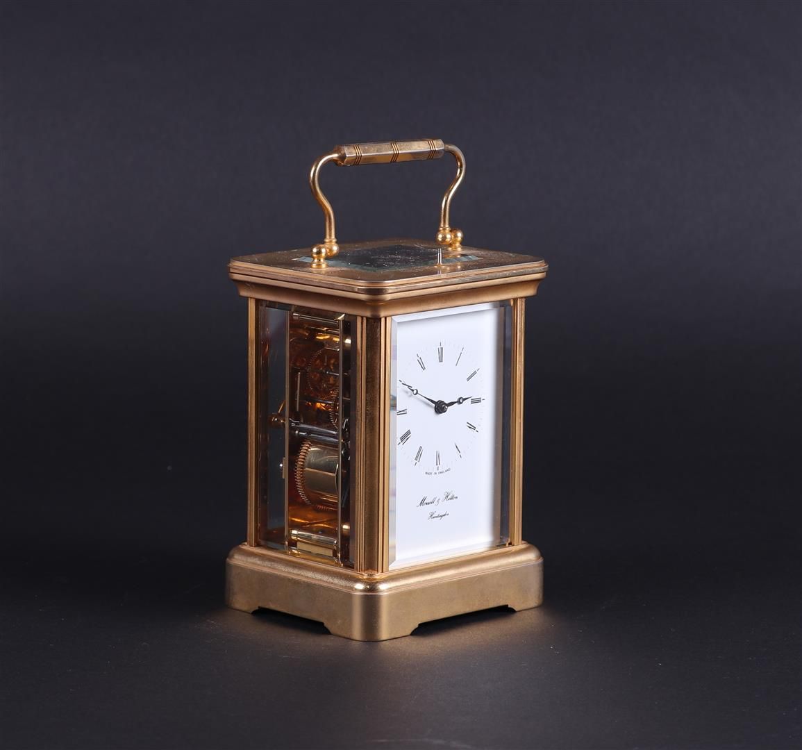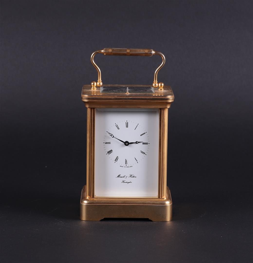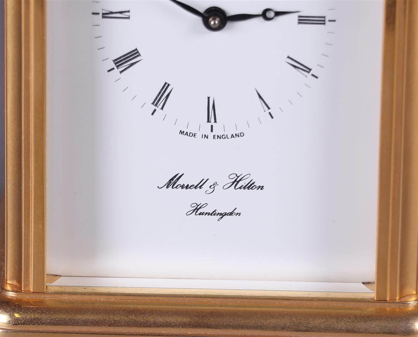 A brass travel clock with enamel dial with Roman numerals and strike on bell. Morrell& Hilton of Huntingdon. Mid, 20th century.