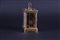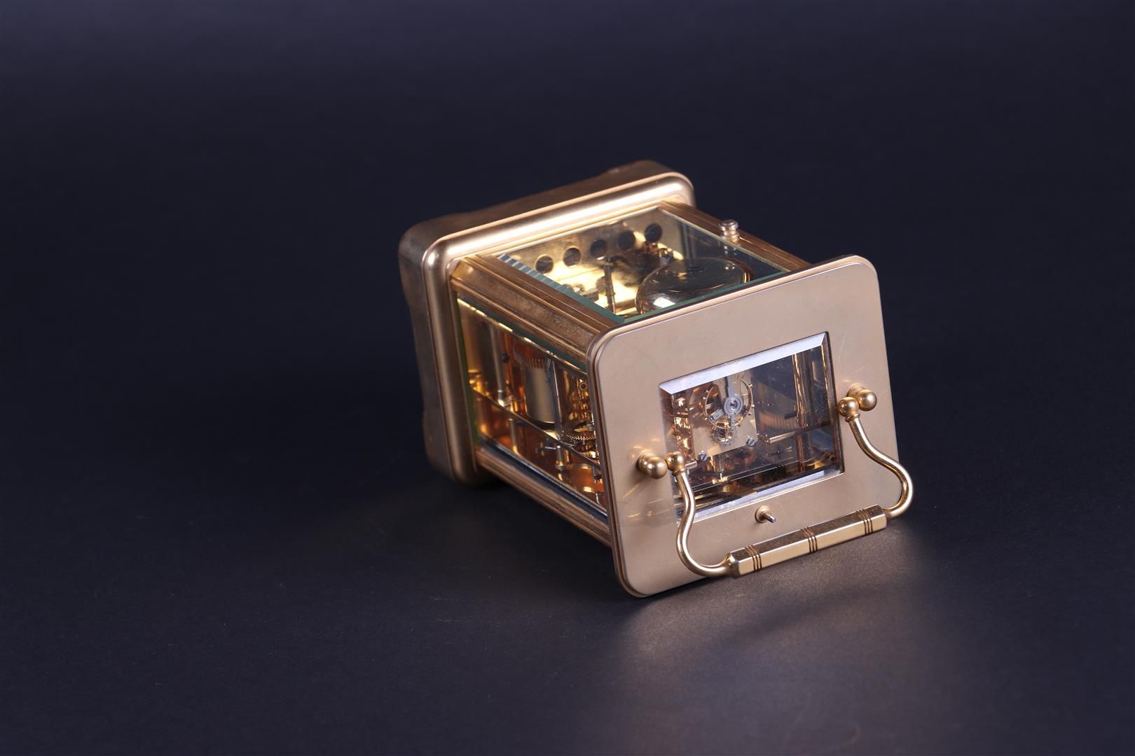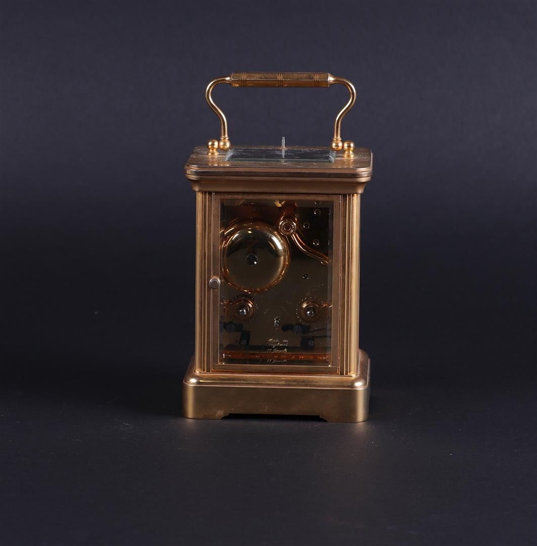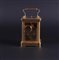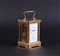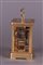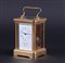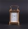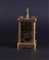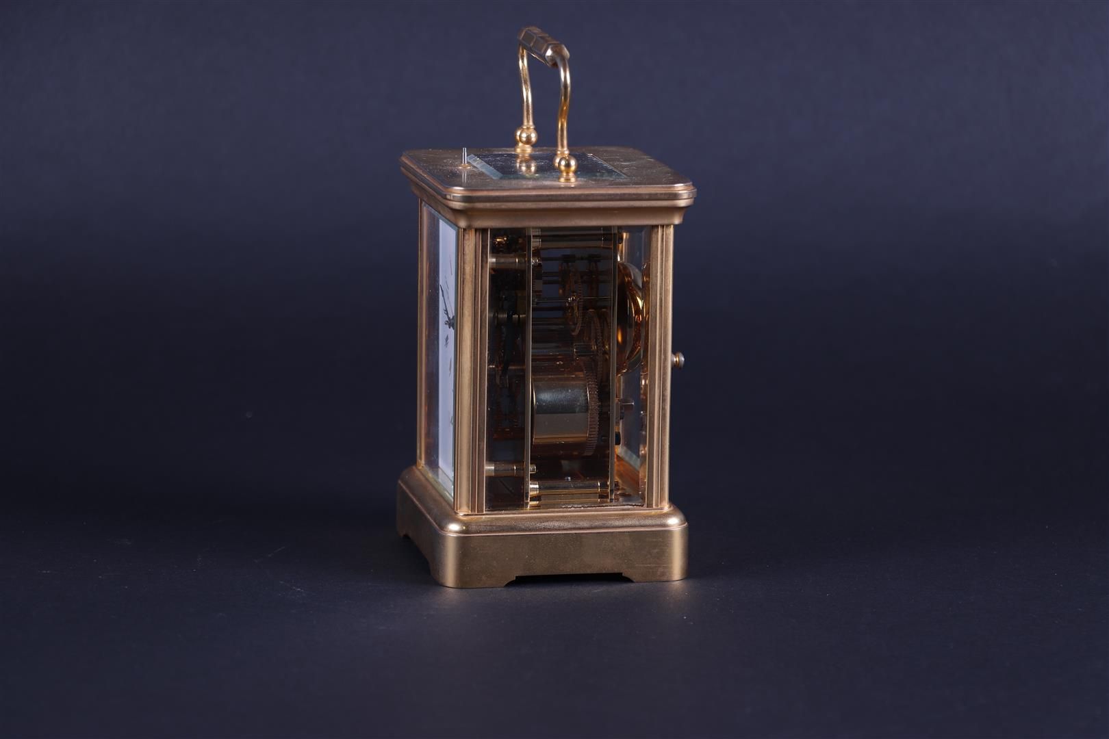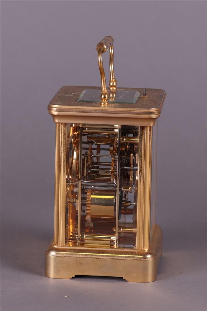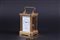 A brass travel clock with enamel dial with Roman numerals and strike on bell....