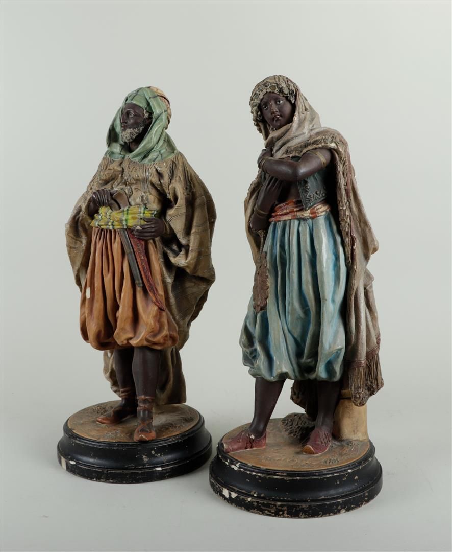 A set of two plaster polychrome painted statues of Arab figures, marked BB on the bottom. Circa 1900.