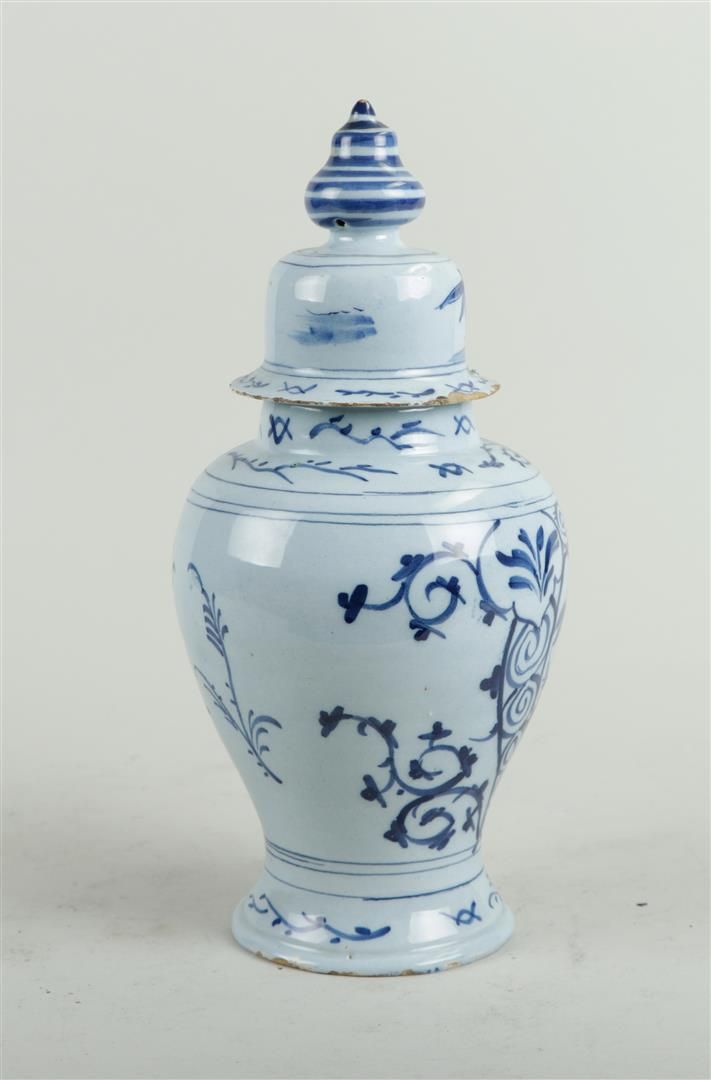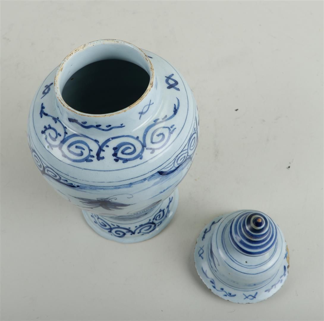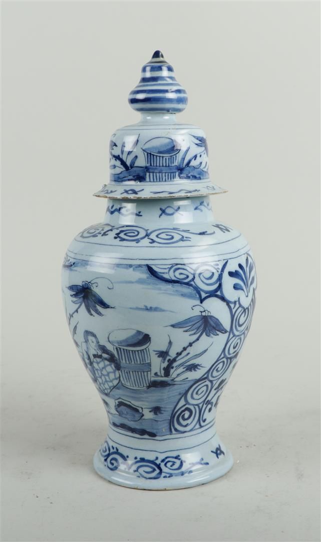 An earthenware covered vase with a decoration of a figure in a garden. Delft, 18th century.