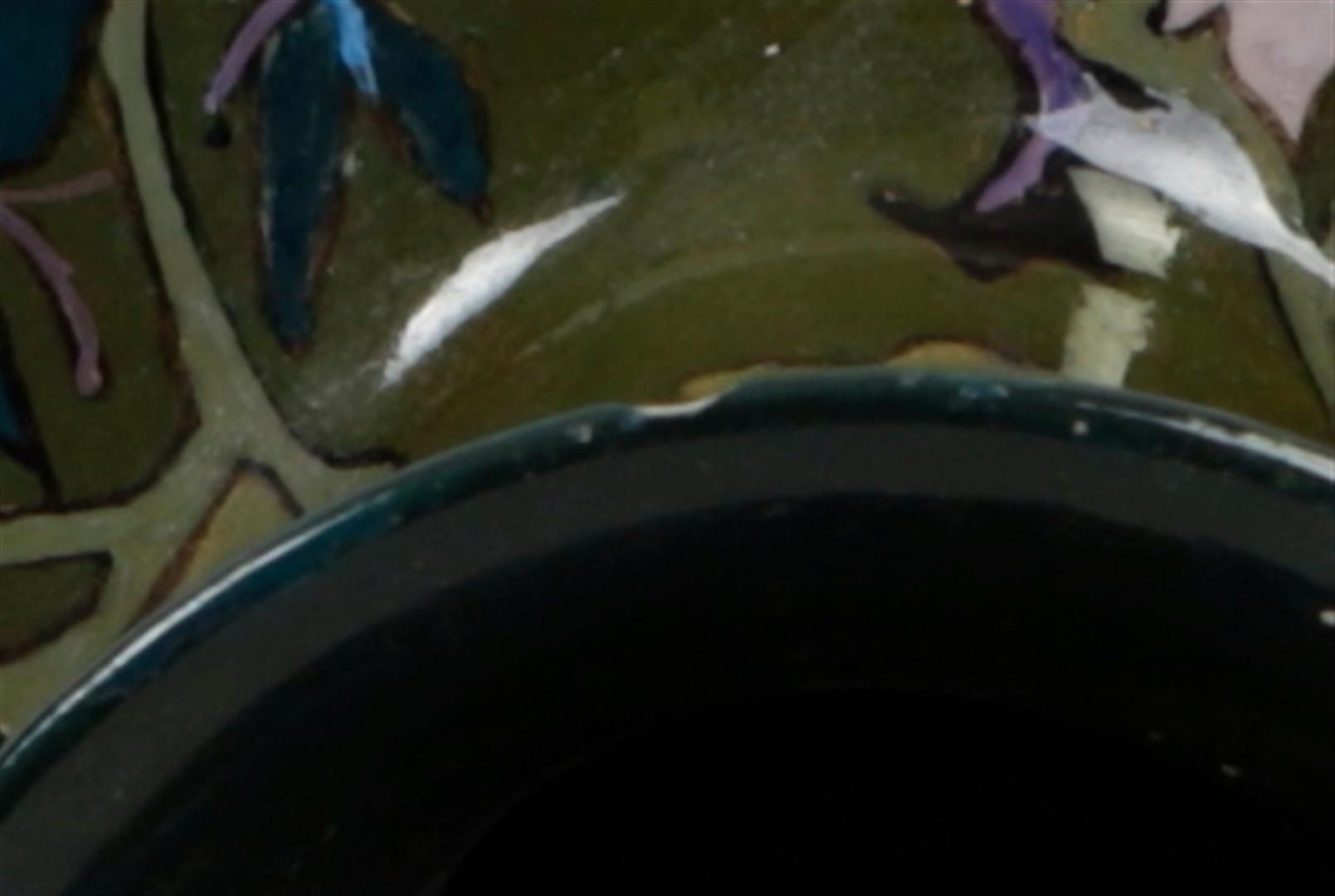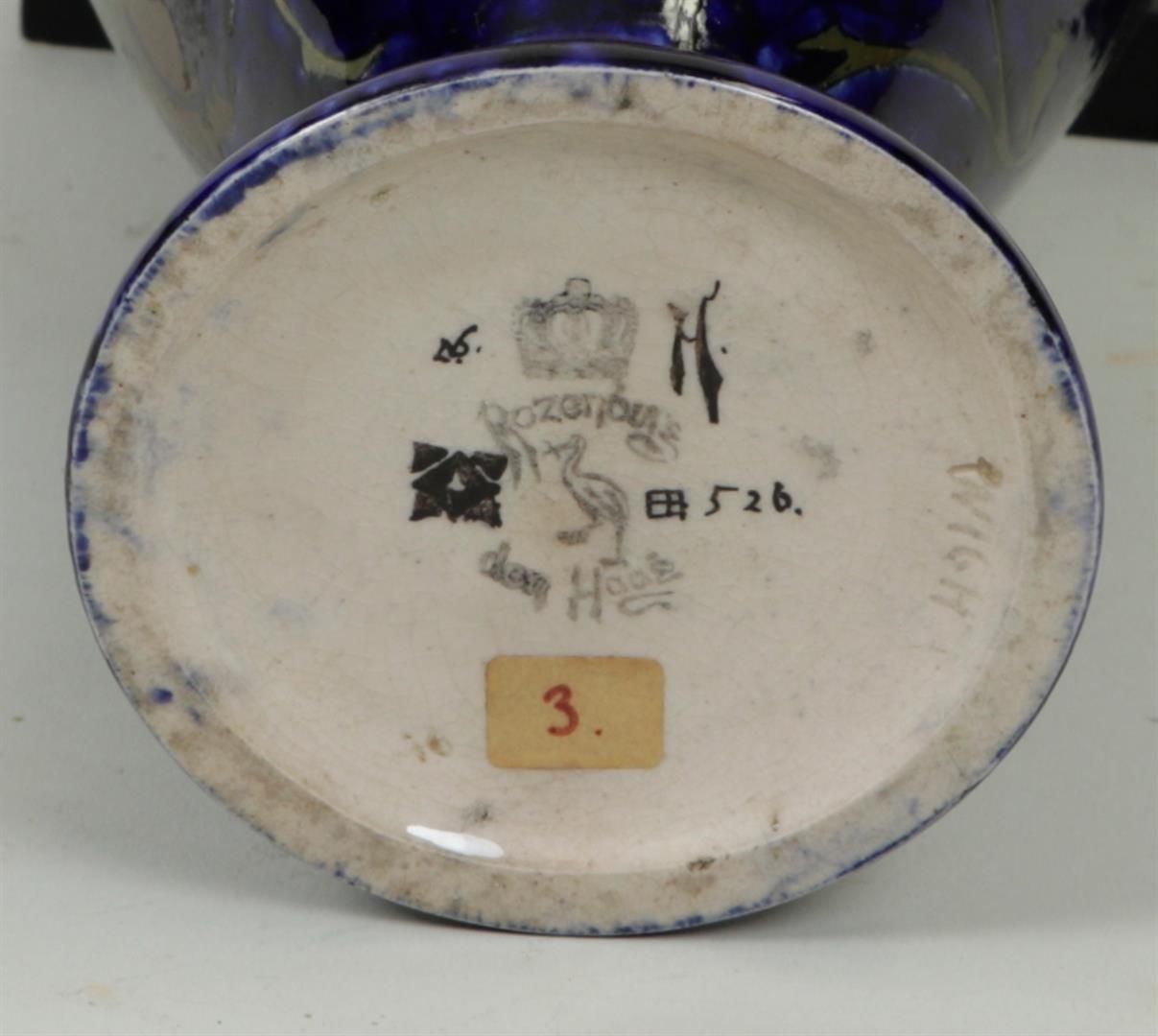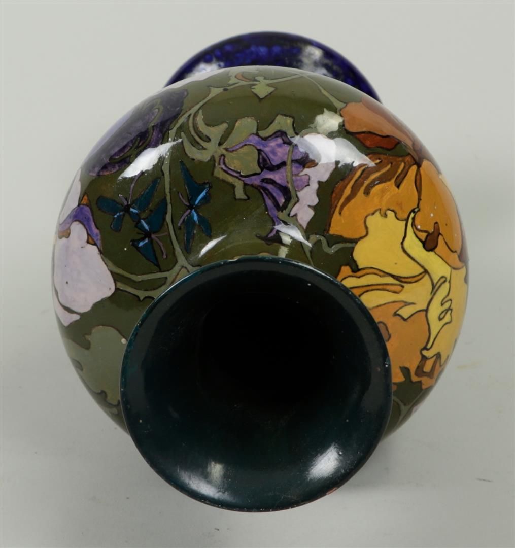 Earthenware vase with polychrome stylized floral decoration, Painter H.G.A. Huyvenaar. Rozenburg, circa 1900.Flee bite on top.