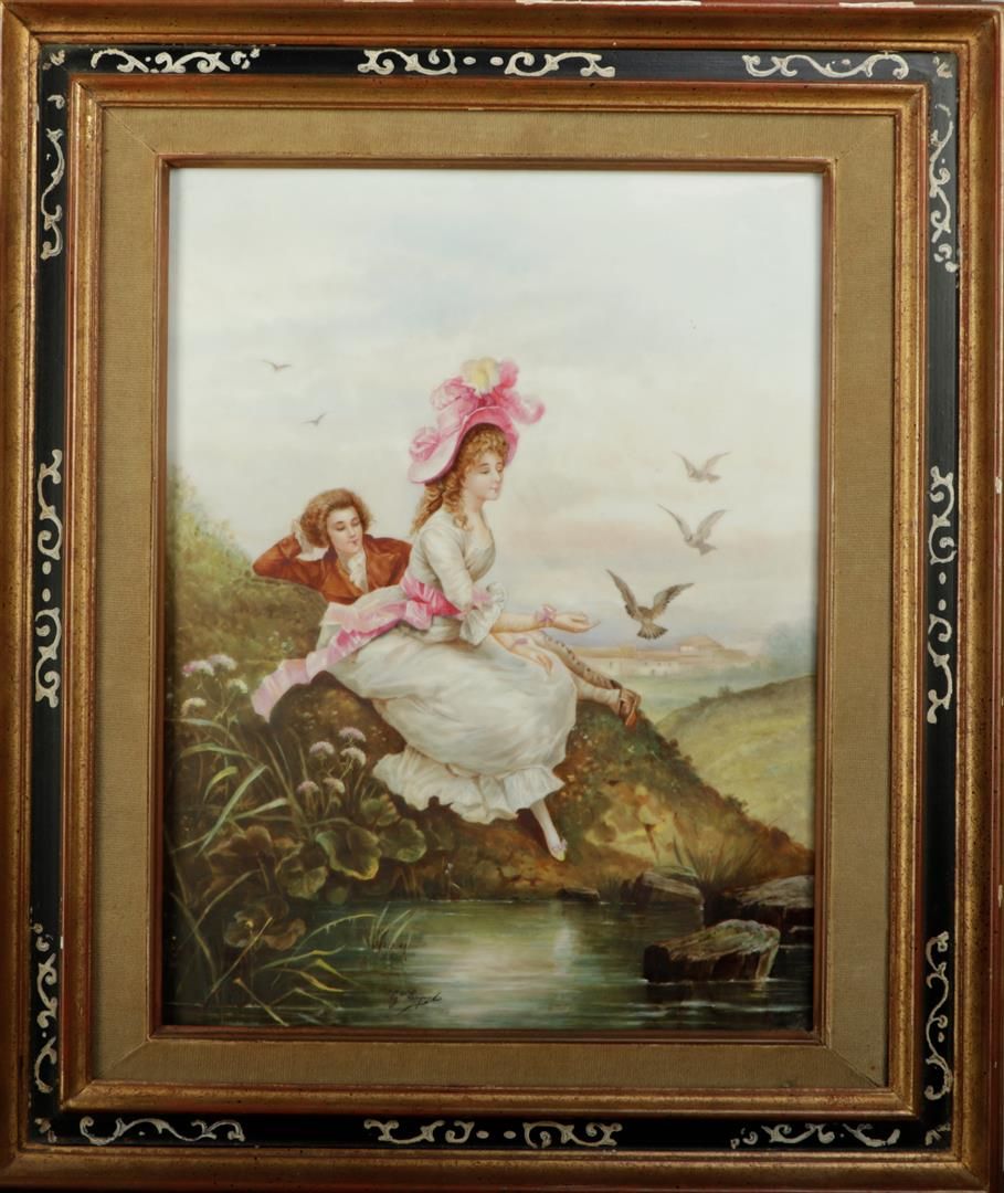 A large porcelain plaque with a decoration of a lady and gentleman at the...