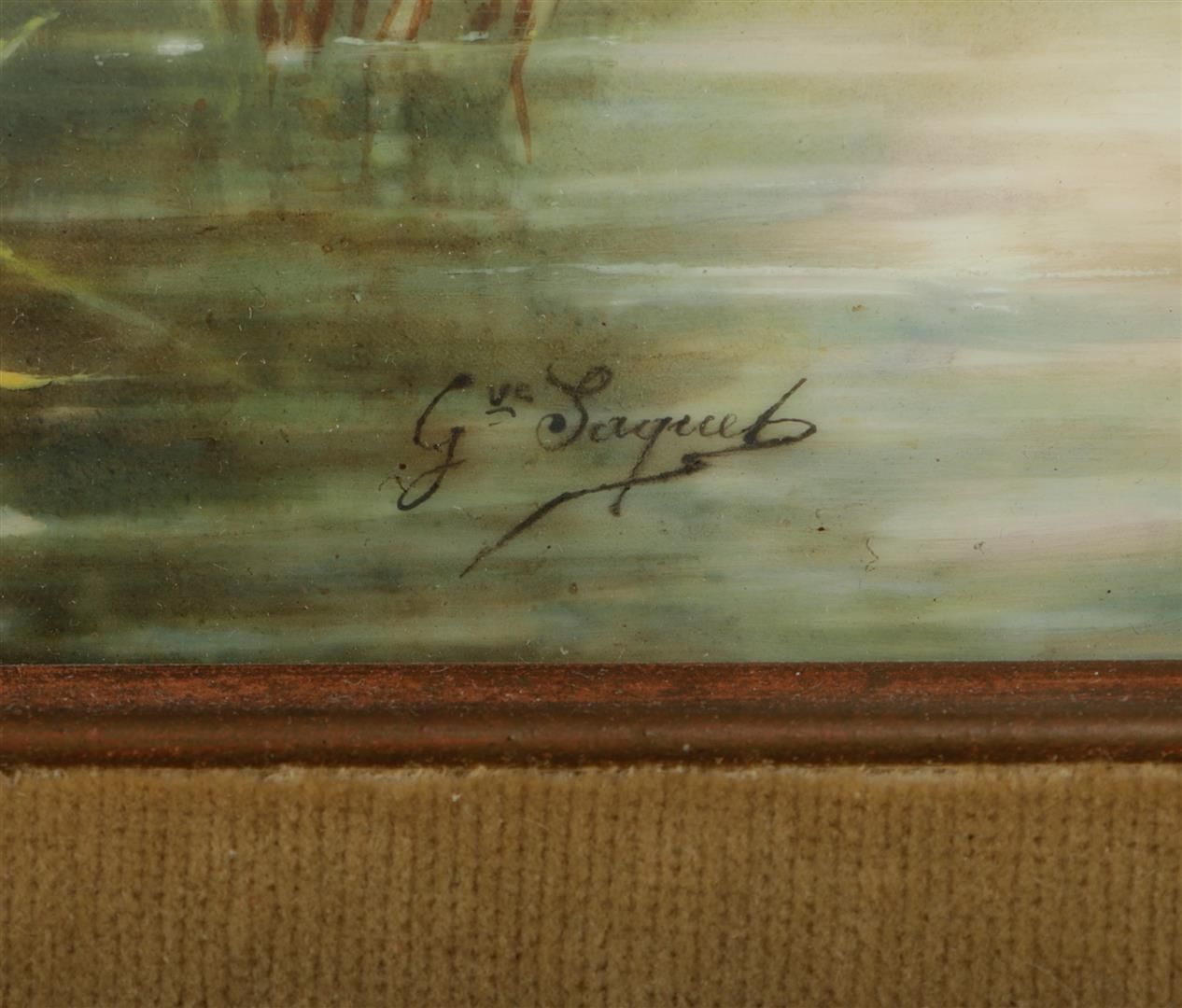 A large porcelain plaque with a decoration of a lady and gentleman at the water, signed "G. Saquet". Limoge France, 19th century.
