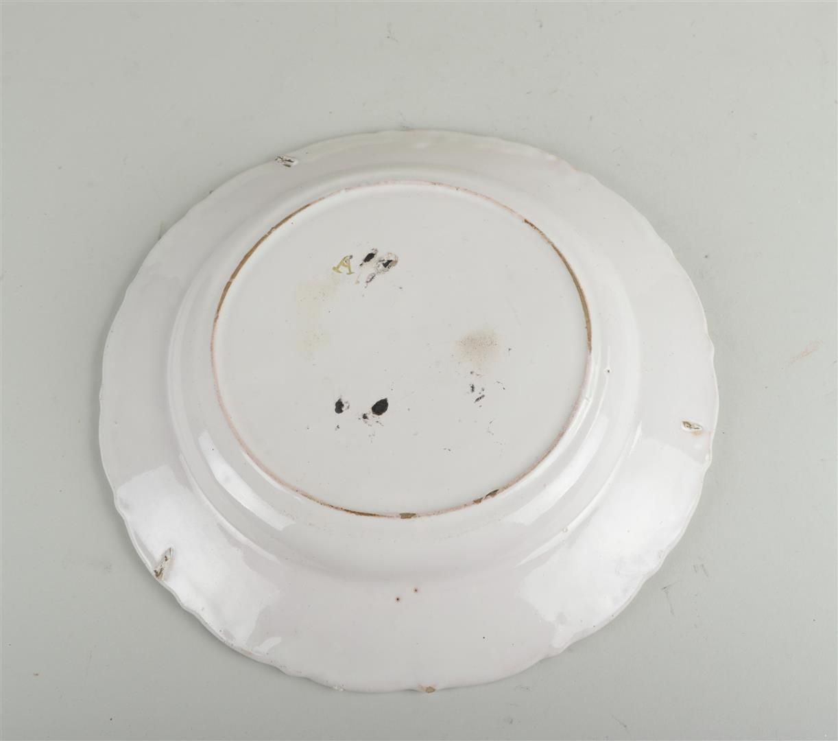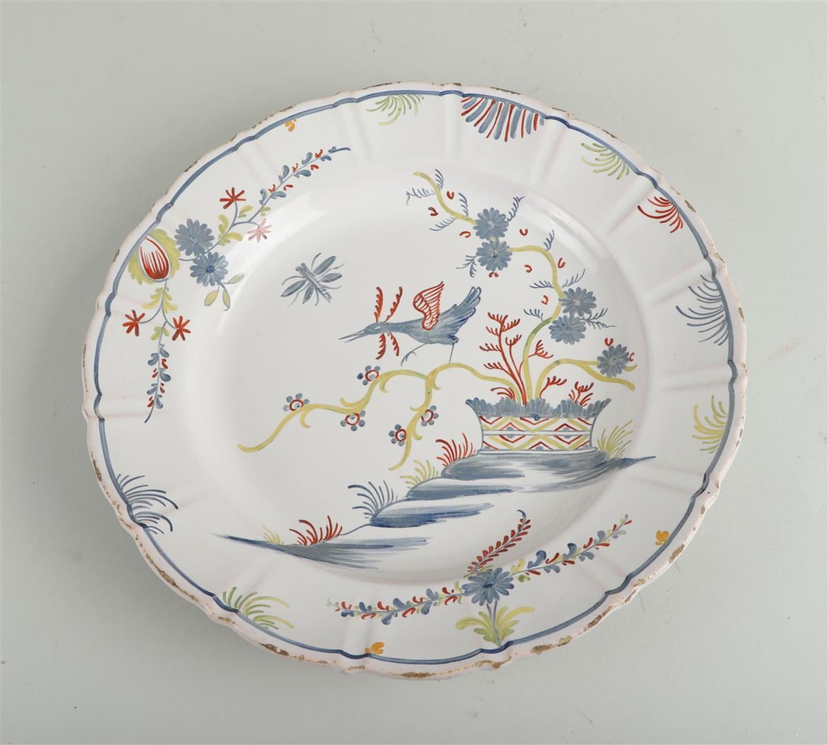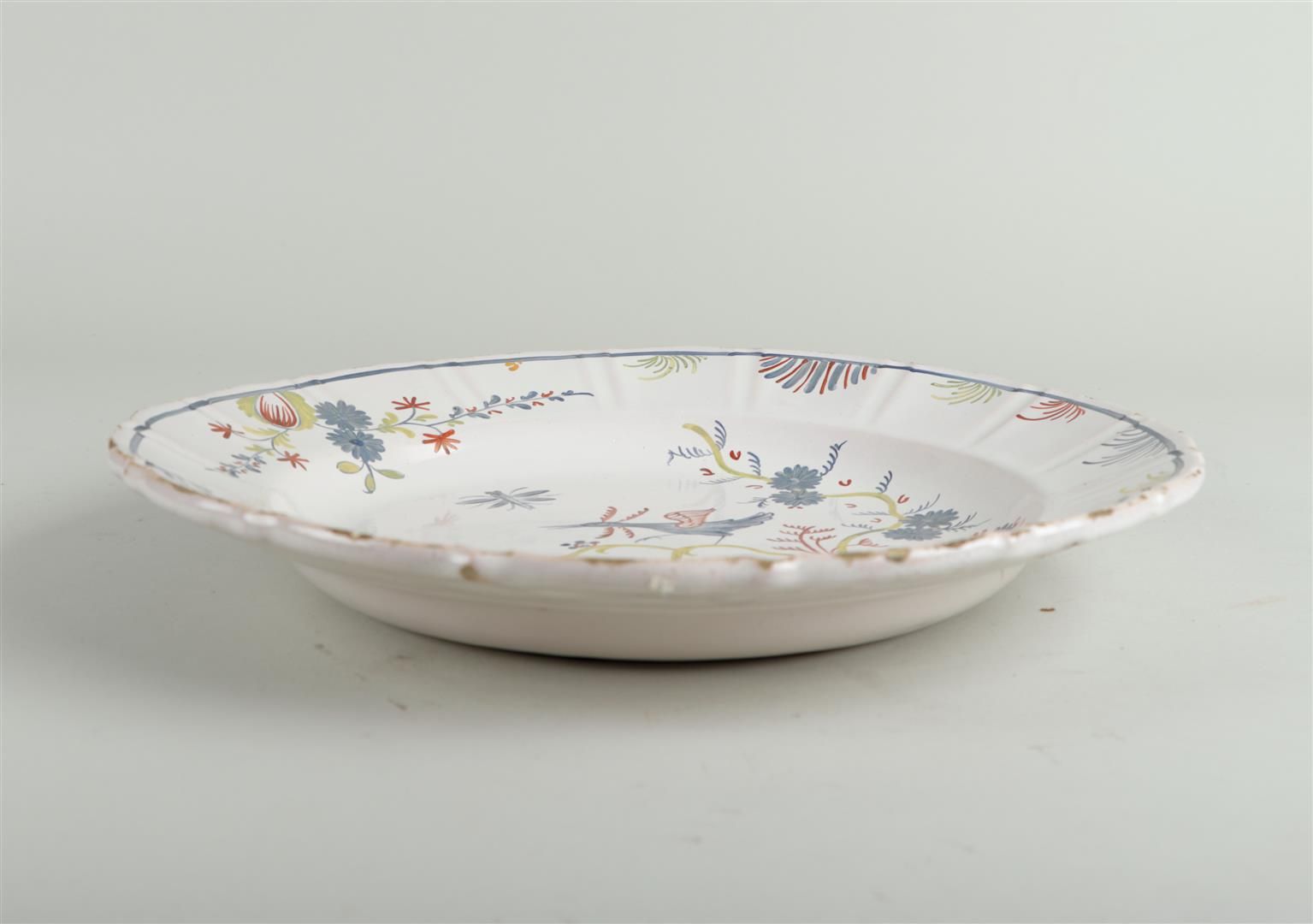 A fiance polychrome painted dish with decoration of birds and flowers, marked 'A' on the back. France, circa 1800.