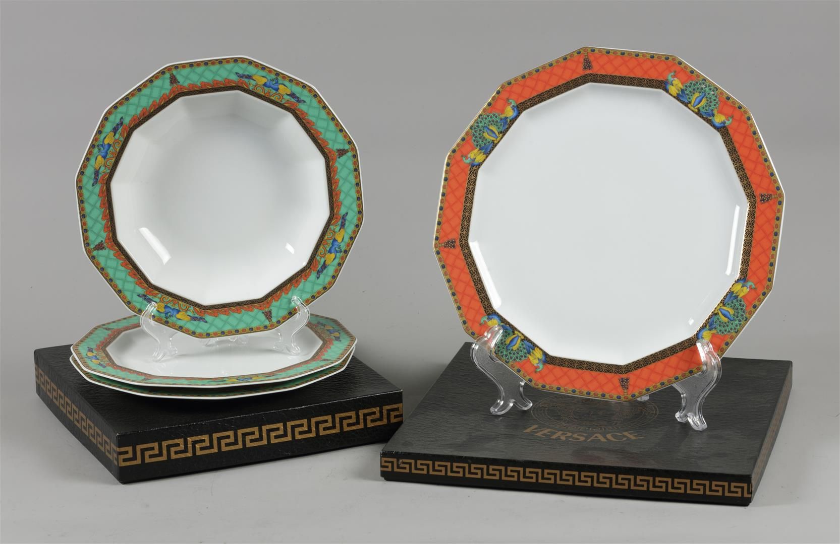 A lot of porcelain plates consisting of a dinner plate, two breakfast plates and a soup plate with Le Voyage de Marco Polo decor, Rosenthal for Versace. Germany, late 20th century.