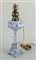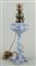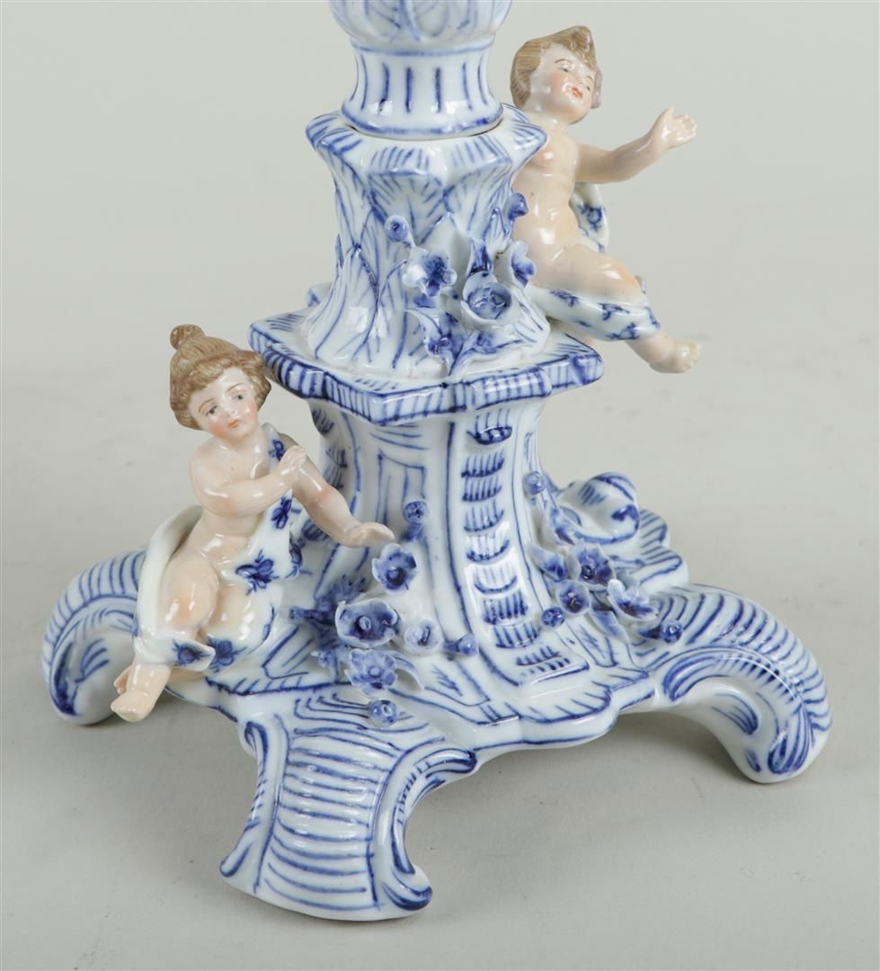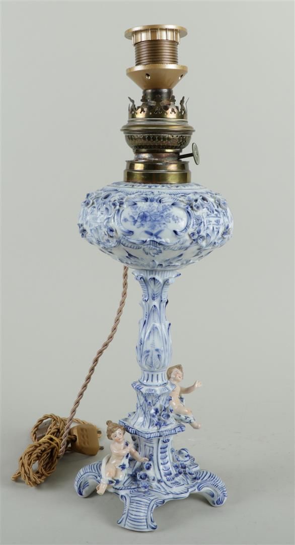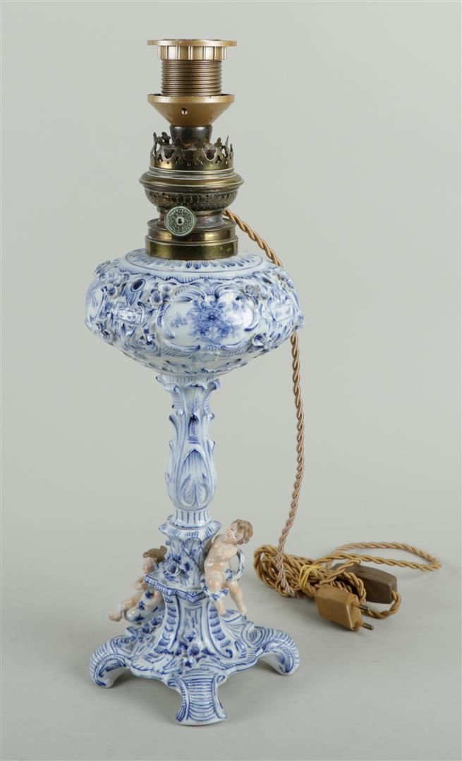 A porcelain oil lamp base in Zwiebelmuster decor decorated with putti....