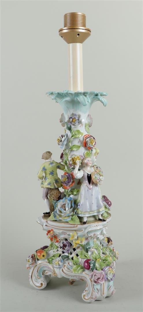 A porcelain lampshade decorated with various figures and flowers. Dresden,...
