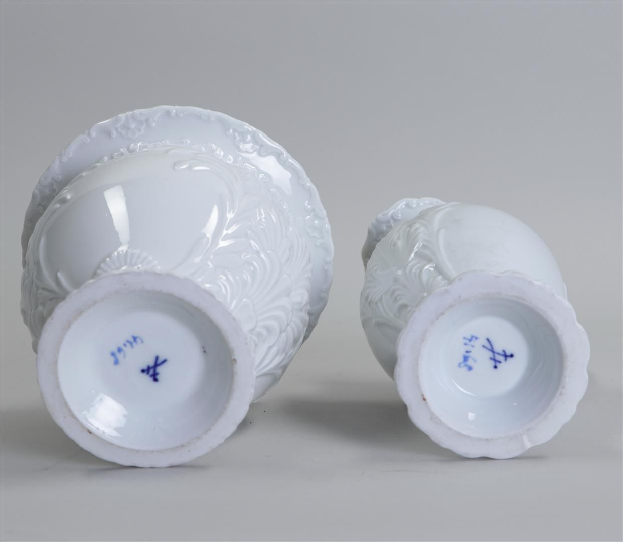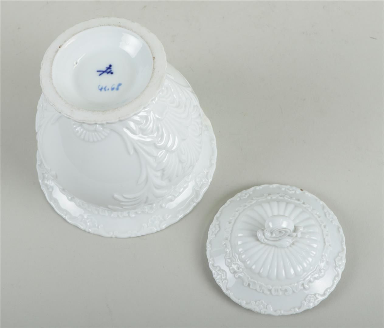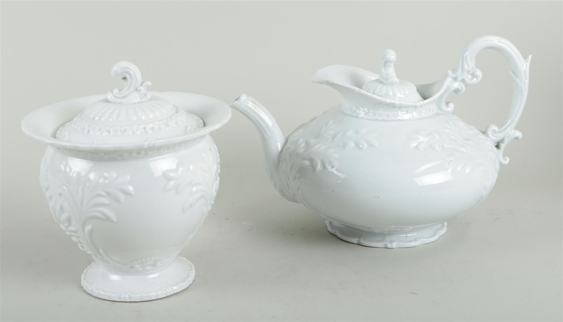 A white porcelain service with relief consisting of a coffee pot, tea pot, cream jug and sugar bowl. Meissen, late 18th century,